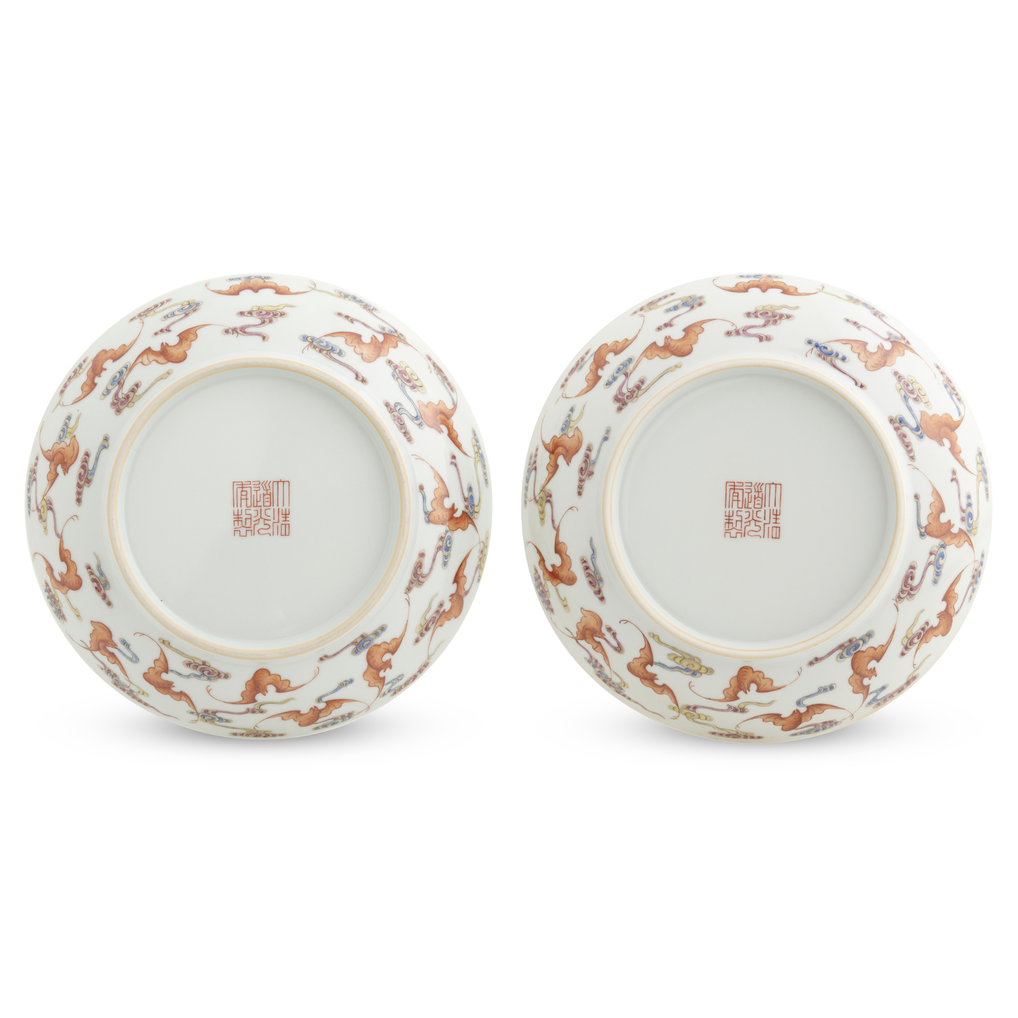 Each dish is finely decorated with a central medallion enclosing a flower basket issuing leafy branches of peony, chrysanthemum and peaches, surrounded by a ruyi-head border below the rim, the exterior with iron-red bats in flight amidst colourful cloud scrolls. The pair is with a fitted box.