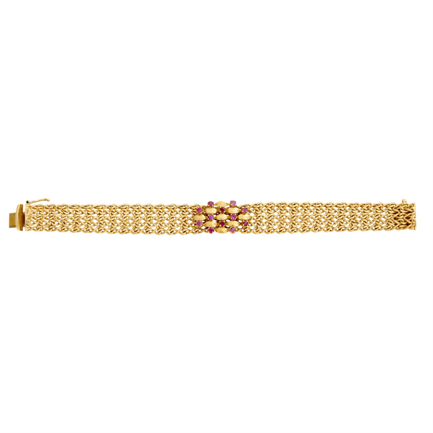 The woven strap centring a textured a panel interset with twelve claw-set brilliant cut rubies, together weighing approximately 0.45 carats, completed by a tongue and groove clasp and safety catch, width 15mm, length approximately 162mm, gross weight approximately 29.1 grams.