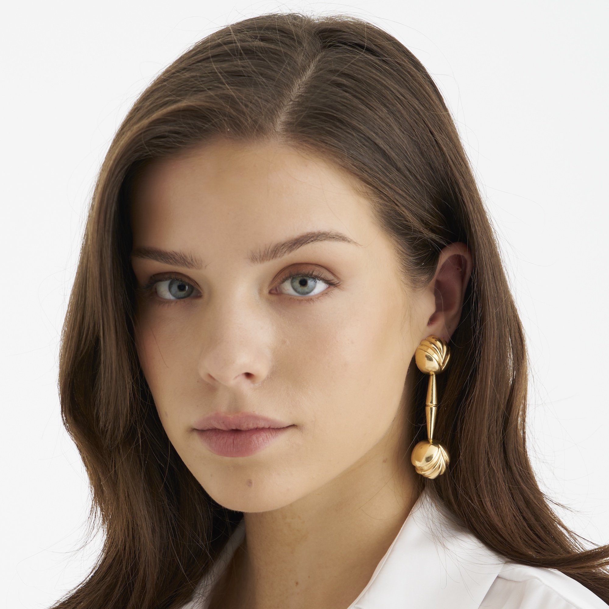Composed of a fluted sphere surmount suspending a gold drop terminating in a fluted ball, to post and clip fittings, length 60mm, gross weight approximately 17.0 grams.