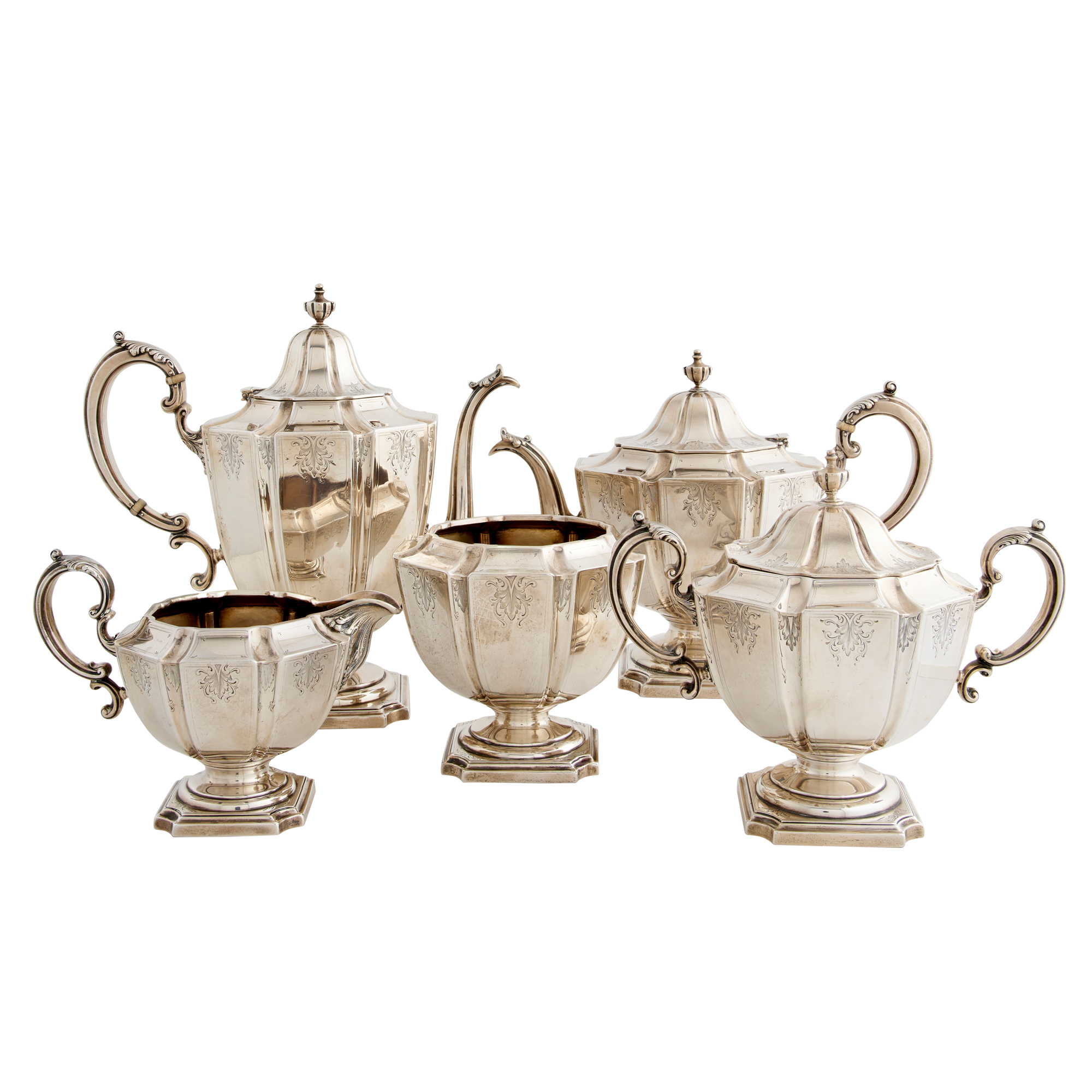 Comprising a tea pot, coffee pot, two-handled covered sugar basin, waste bowl and cream jug, each of faceted shape with chamfered edges, on conforming spreading feet, the hinged covers with urn-form finials, each piece engraved with anthemion designs