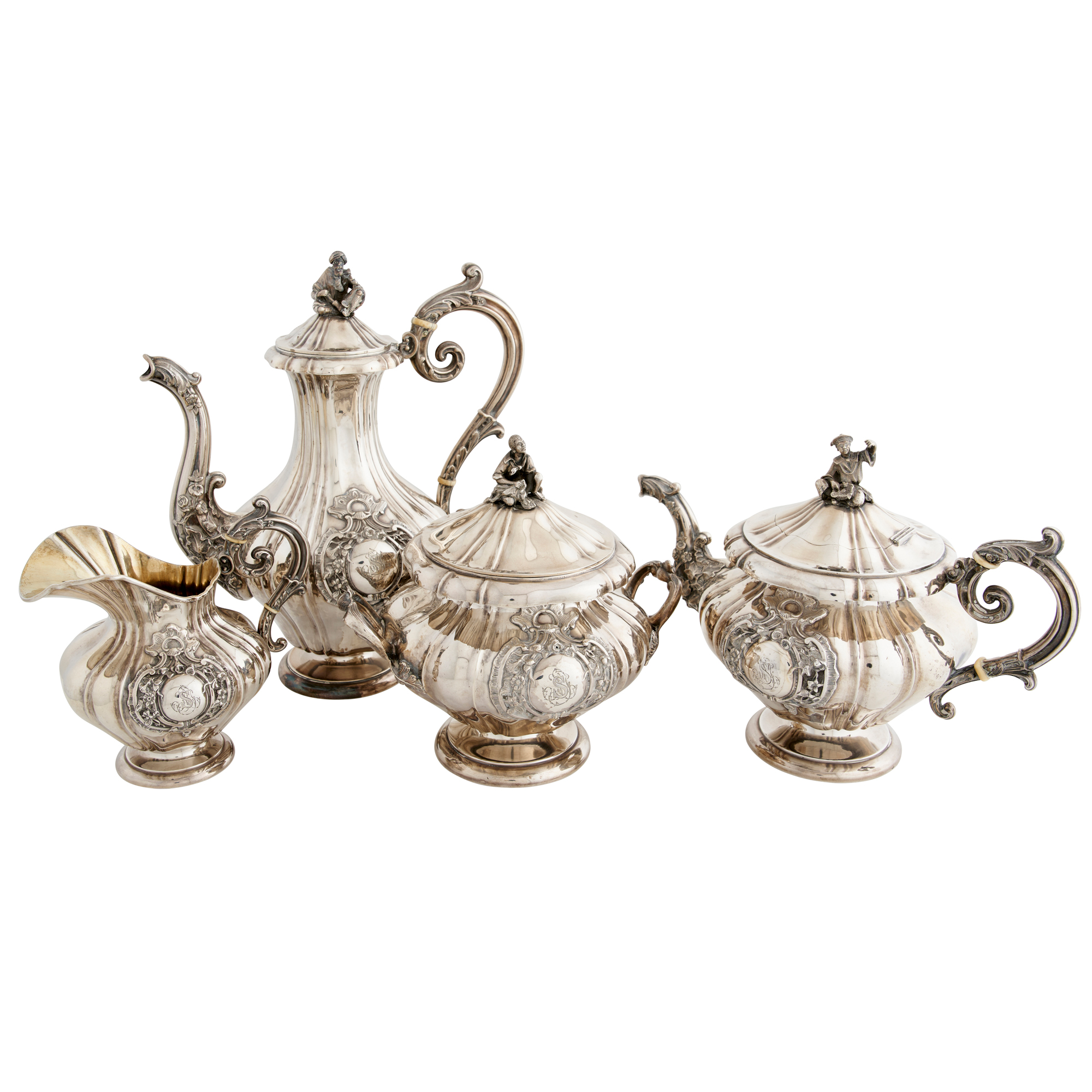 Comprising a tea pot, coffee pot, two-handled sugar basin, and cream jug, each of conforming baluster-shape with scrolling handles, on spreading circular feet, the covers with exotic figural finials, each piece engraved with initials within a decorative reserve, repousse floral and foliate decoration to each side and spouts