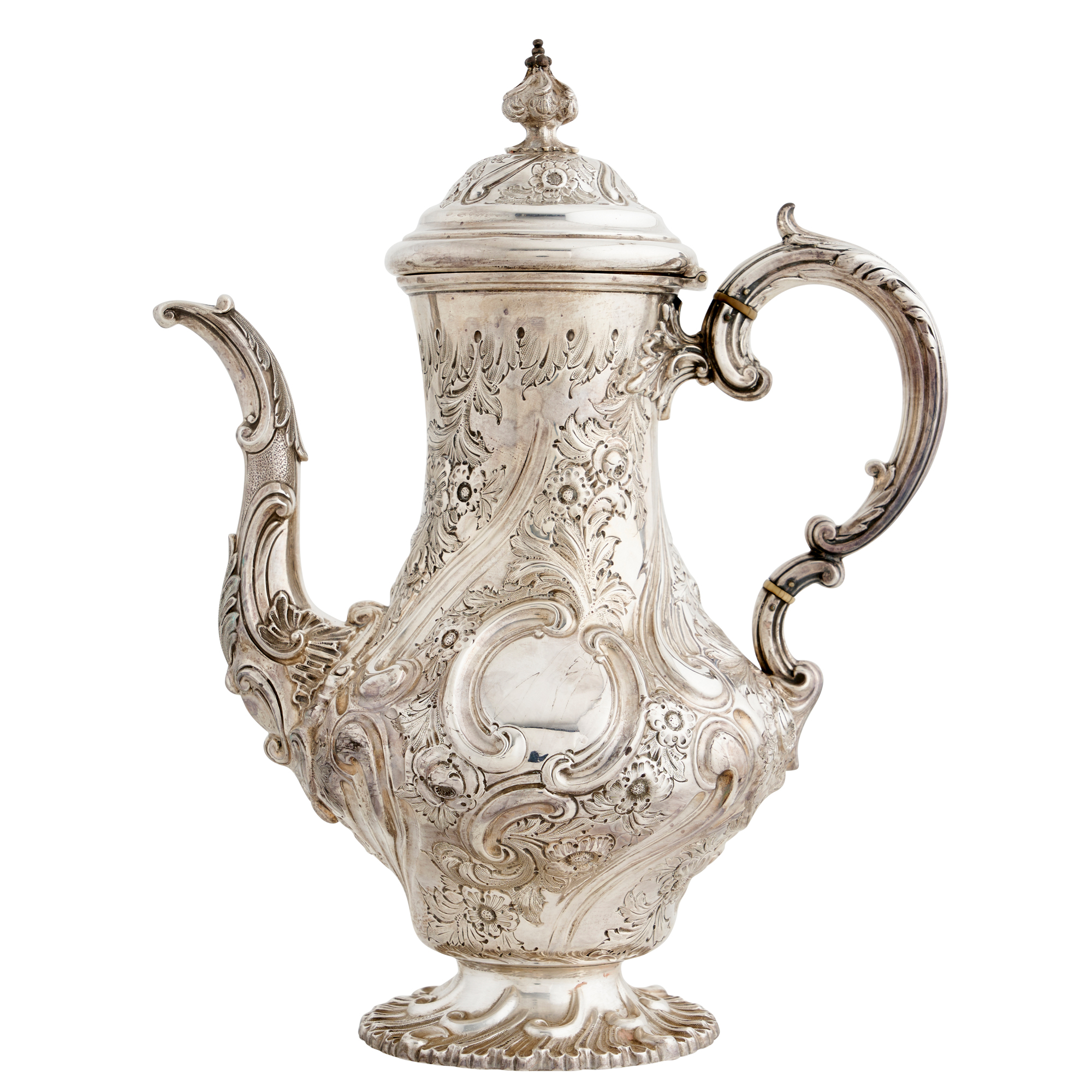 Baluster-shaped, on a spreading circular foot, with double scroll handle and domed cover with moulded knop finial, repousse floral, foliate and scrollwork decoration overall