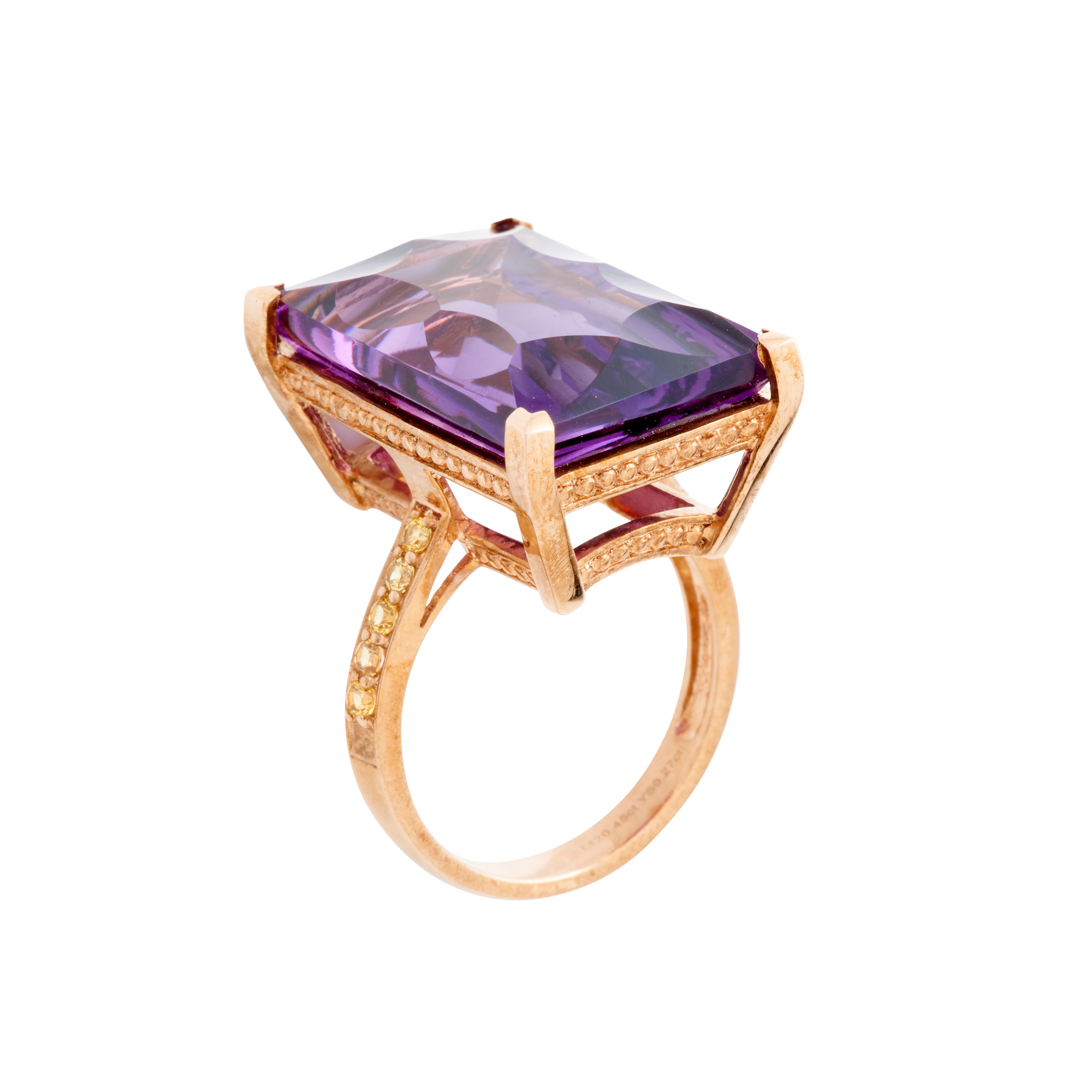 Featuring a corner-claw set fancy rectangular-cut amethyst weighing approximately 20.45 carats, to shoulders detailed with circular-cut yellow sapphires together weighing approximately 0.27 carats,