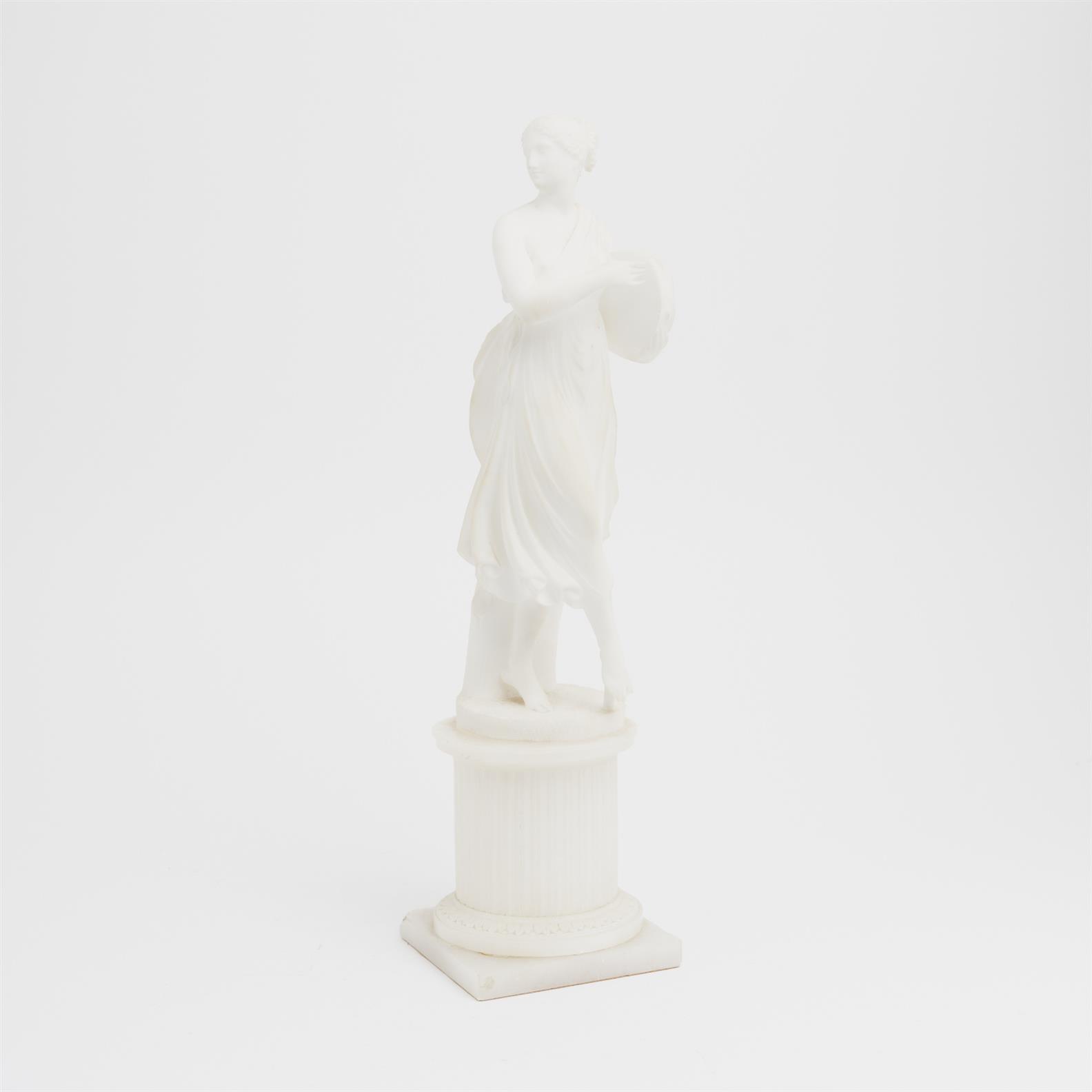 A CARVED MARBLE FIGURE OF A FEMALE TAMBOURINE PLAYER, MOUNTED ON A QUARTZ BASE (A/F) H.49CM
