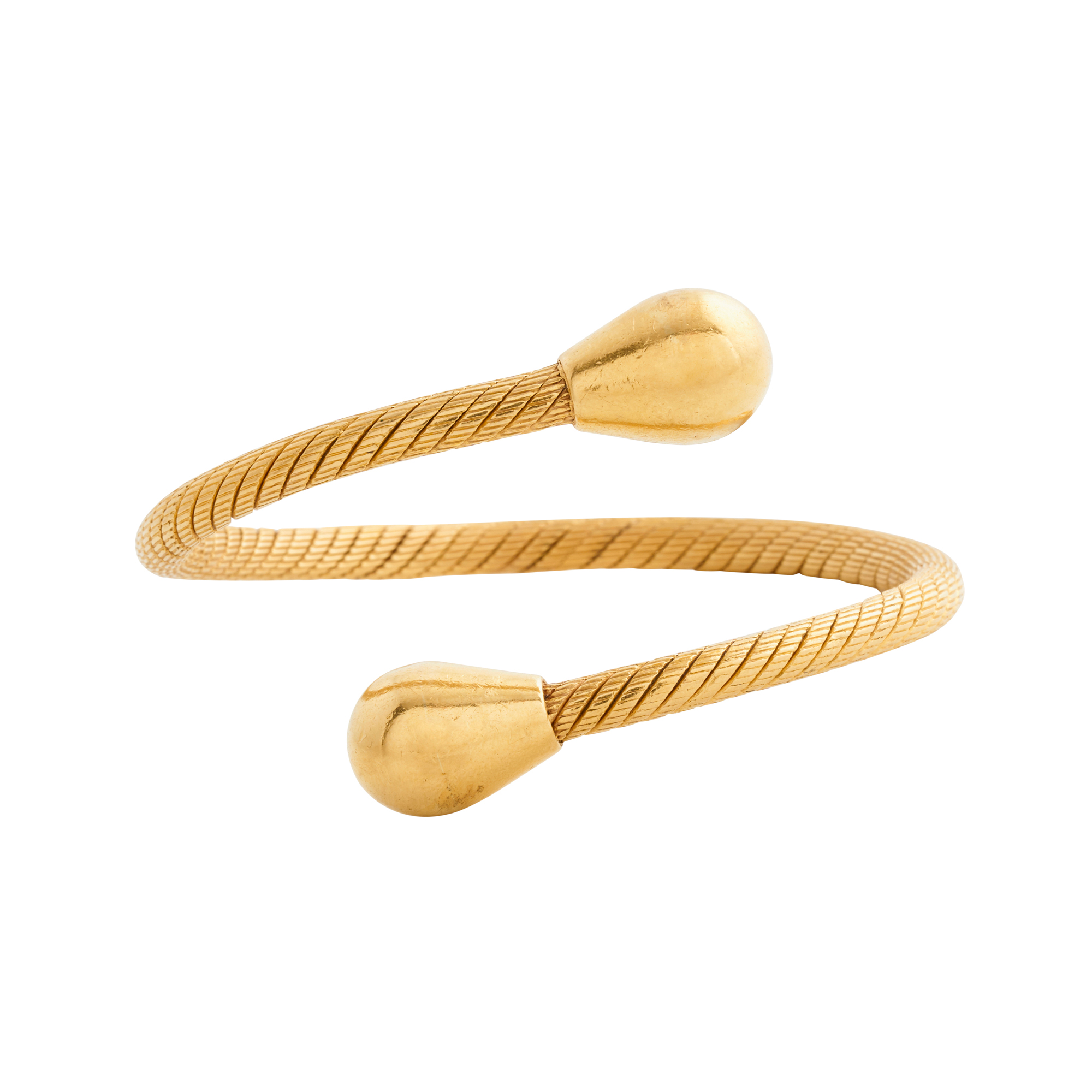 Of bypass design, styled in textured gold with drop shaped polished gold terminals, inner diameter 200mm, gross weight approximately 92.1 grams.