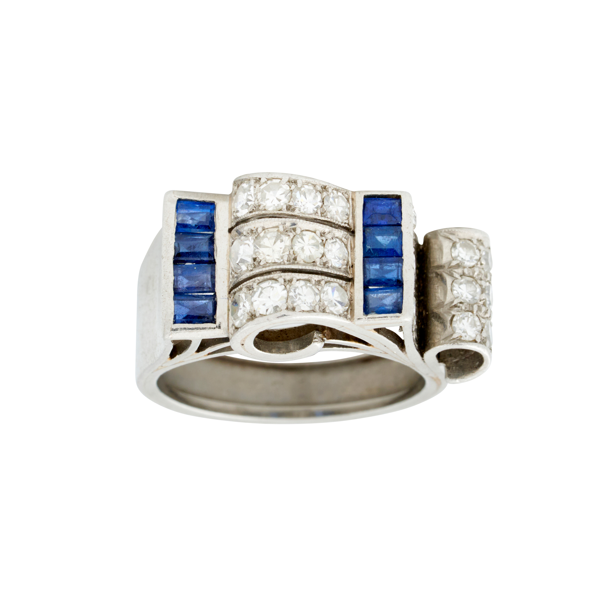 Of retro scrolled design, detailed with single-cut diamonds and panels of carre-cut sapphires, size M, gross weight approximately 11.0 grams.