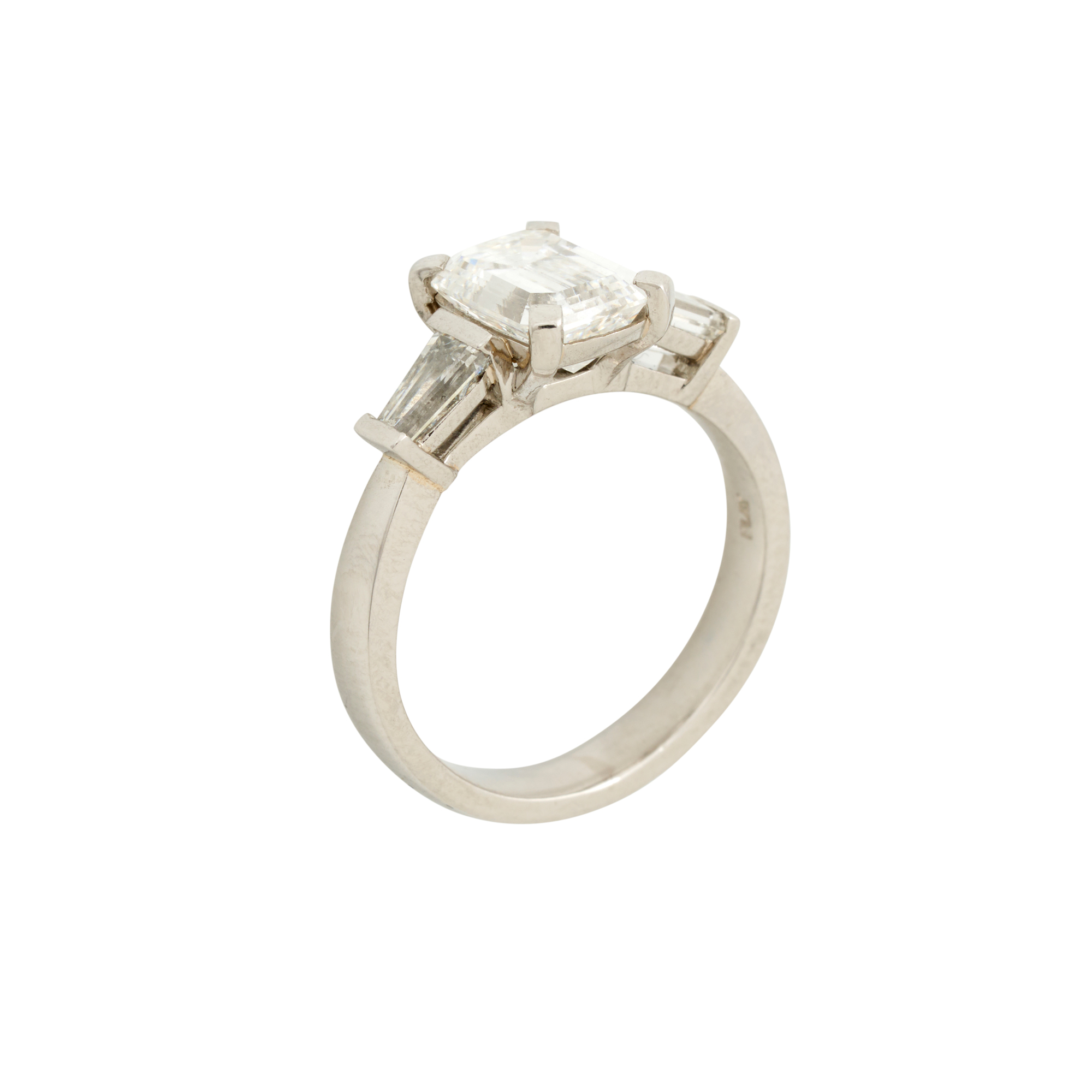 Corner claw-set with an emerald-cut emerald weighing 1.71 carats, flanked by tapered baguette-cut diamonds, size I, gross weight approximately 5.6 grams.