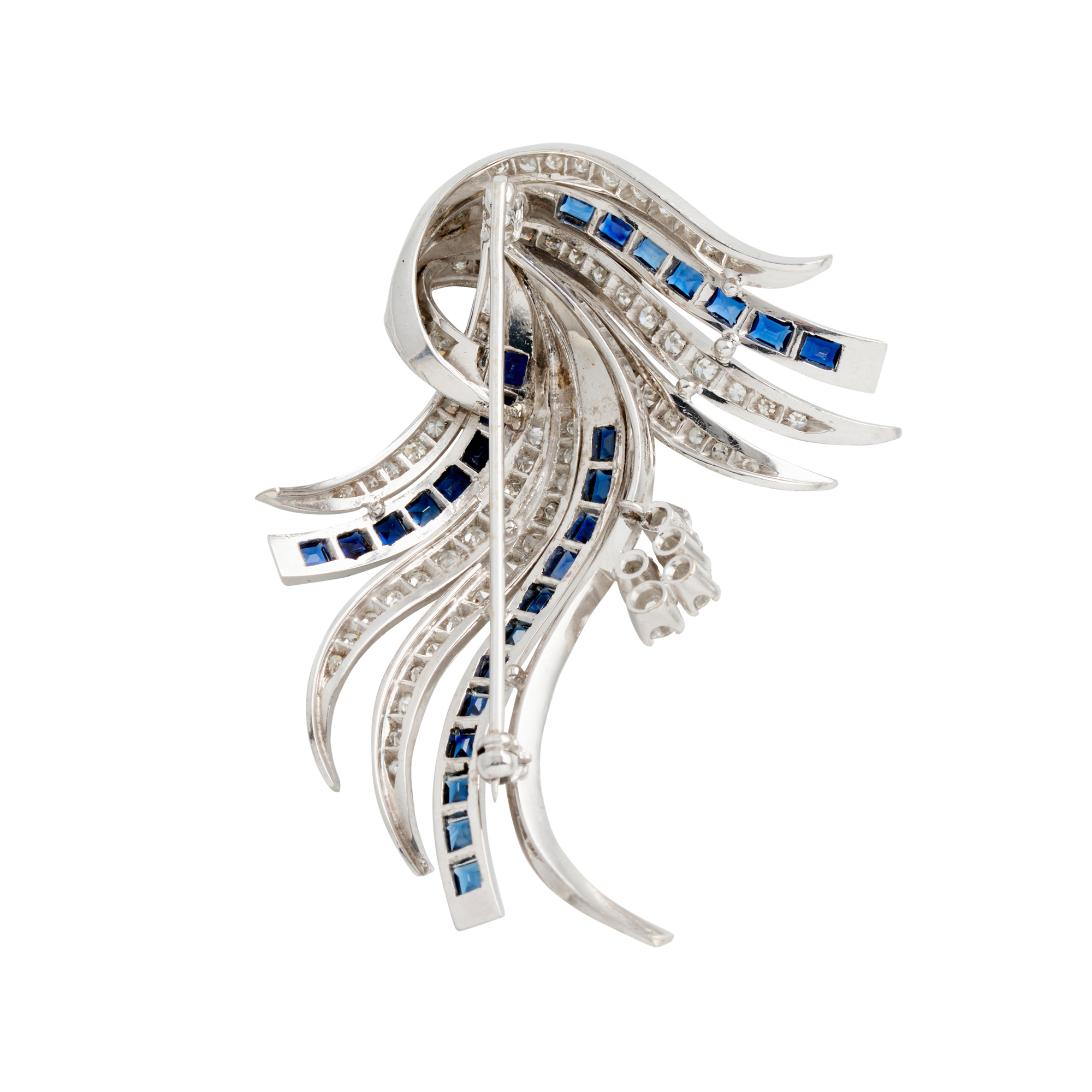 Of retro scroll design, detailed with channel set baguette-cut sapphires claw-set brilliant-cut diamonds and grain-set single-cut diamonds, the sapphires together weighing approximately 1.90 carats, the diamonds together weighing approximately 1.25 carats. length 42mm, width 55mm, gross weight approximately 17.6 grams.