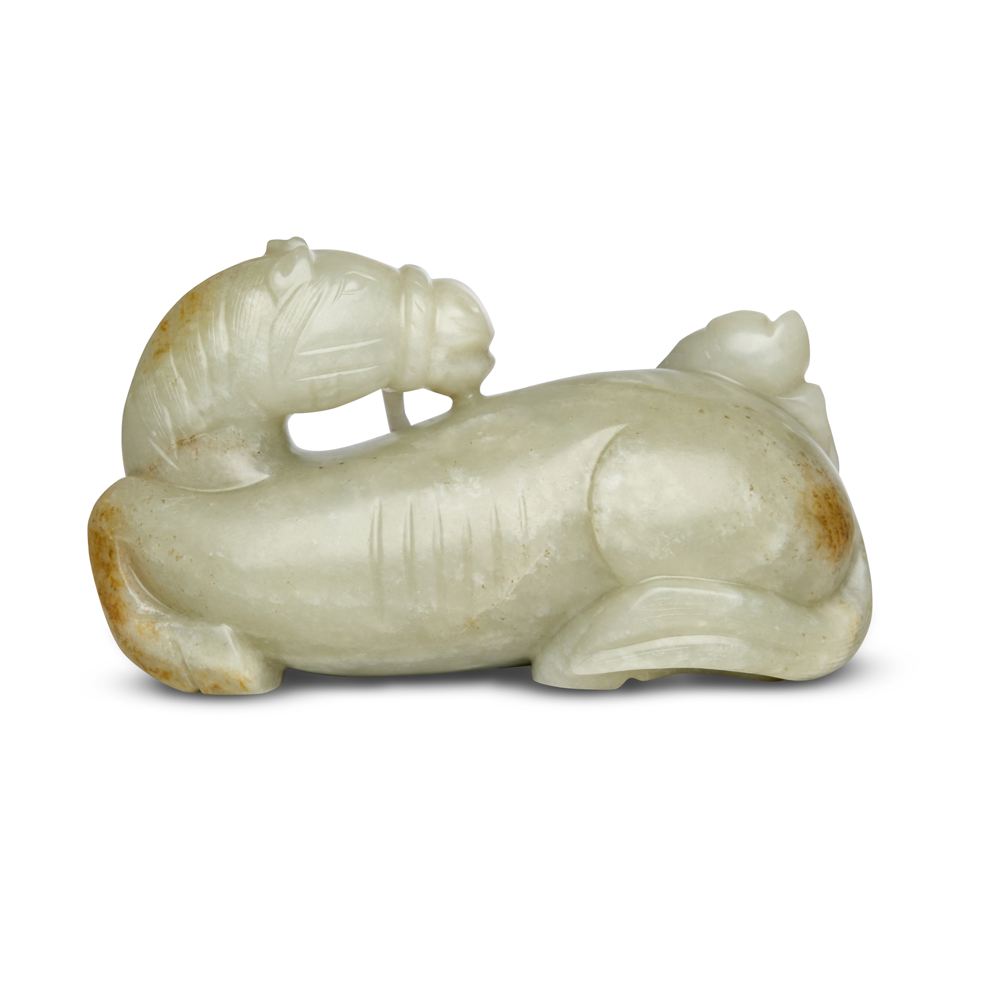 Jade carvings of foreign figures are extremely rare, with most known examples dating from the Tang to Ming dynasties. For comparable figures, see Christie¡¯s New York, 13 September 2018, lot 903, and Sotheby¡¯s London, 8 December 2022, lot 249. For a related jade group depicting a horse and groom, see Christie¡¯s Hong Kong, 30 May 2024, lot 2987. A jade horse carved in a similar pose was sold at Bonhams London, 11 November 2010, lot 26.