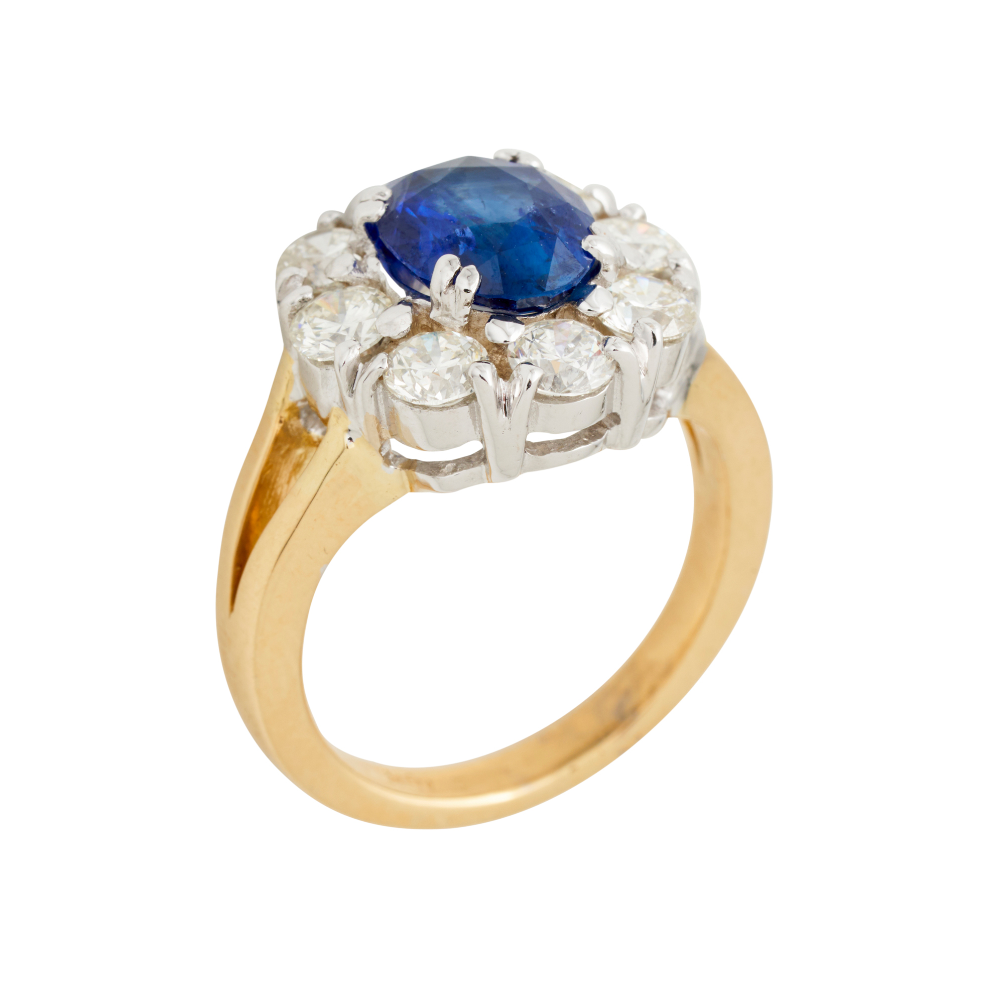 Centring a claw-set oval-cut sapphire weighing approximately 3.01 carats, surrounded by eight claw-set round brilliant cut diamonds together weighing approximately 2.20 carats, size O , gross weight approximately 11.7 grams.