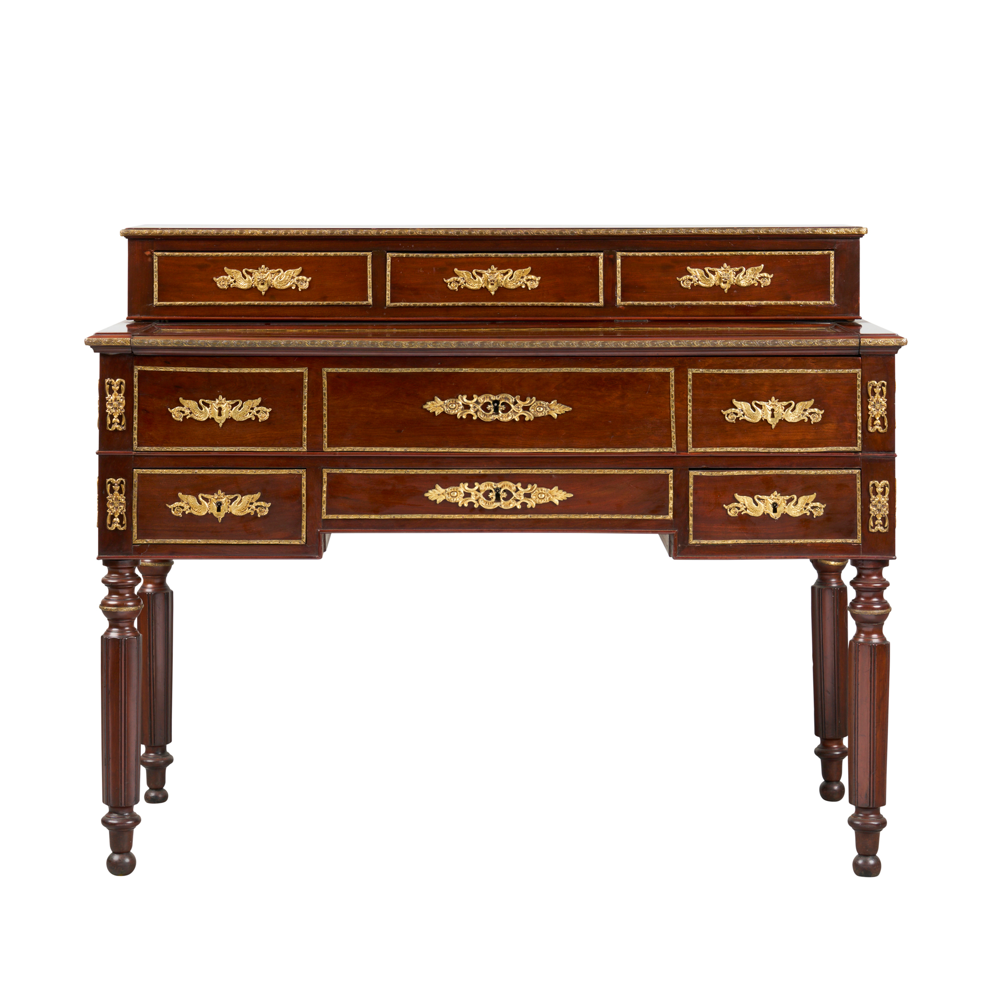 In Louis XVI manner, the gallery of three drawers above the retracting top and extending fall-front secretaire compartment enclosing leather-lined writing surface and three small drawers, three further drawers below, raised on turned and fluted supports, the front and sides with various Classical paired swan and foliate mounts and mouldings