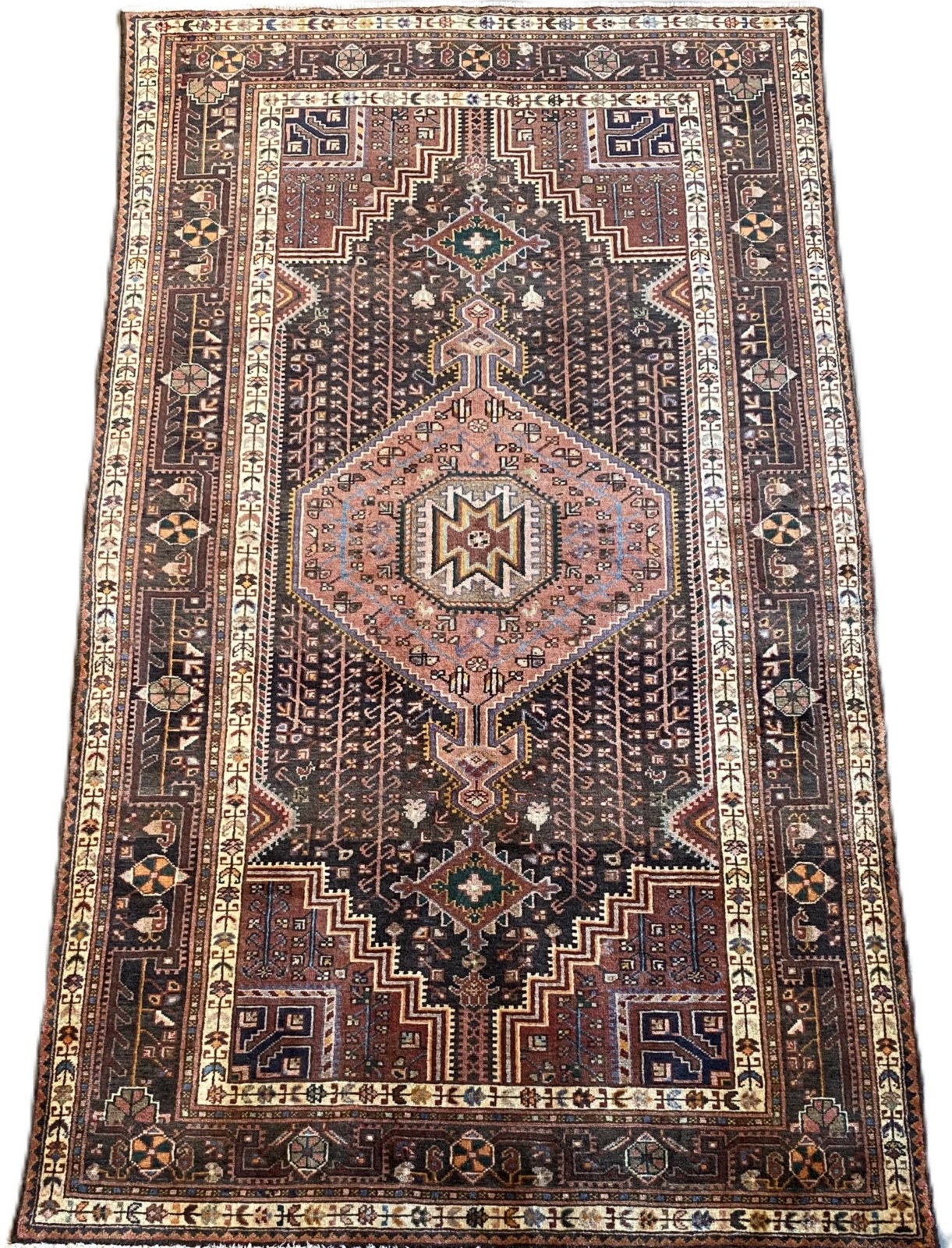 WOOL & VEGETABLE DYES. HAND-KNOTTED VILLAGE WEAVE FROM THE HAMADAN REGION WITH A DISTINCT DESIGN OF CENTRAL HEXAGONAL ANCHORED MEDALLION CONTAINING A TRIBAL AMULET IN A CHARCOAL FIELD OF MULTIPLE ROWS OF TREE OF LIFE PATTERNS. BORDER OF ROSETTES.