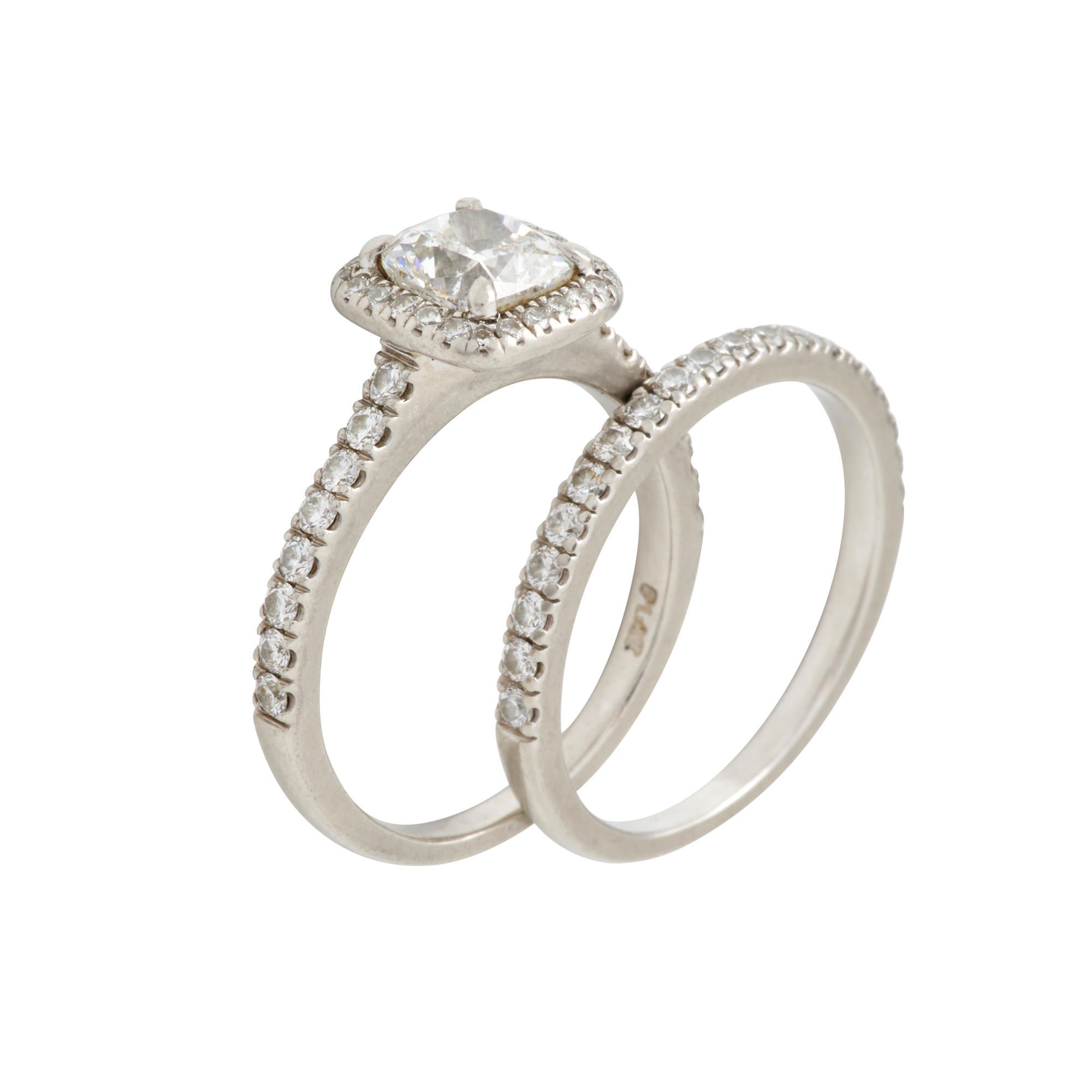 Of cluster design centring a cushion cut diamond of 1.31 carats within a surround of micro claw-set brilliant cut diamonds to diamond set shoulders, the diamonds together weighing approximately 0.25 carats; together with a band micro claw-set with round brilliant-cut diamonds together weighing approximately 0.38 carats, size P½, gross weight approximately 9.8 grams.