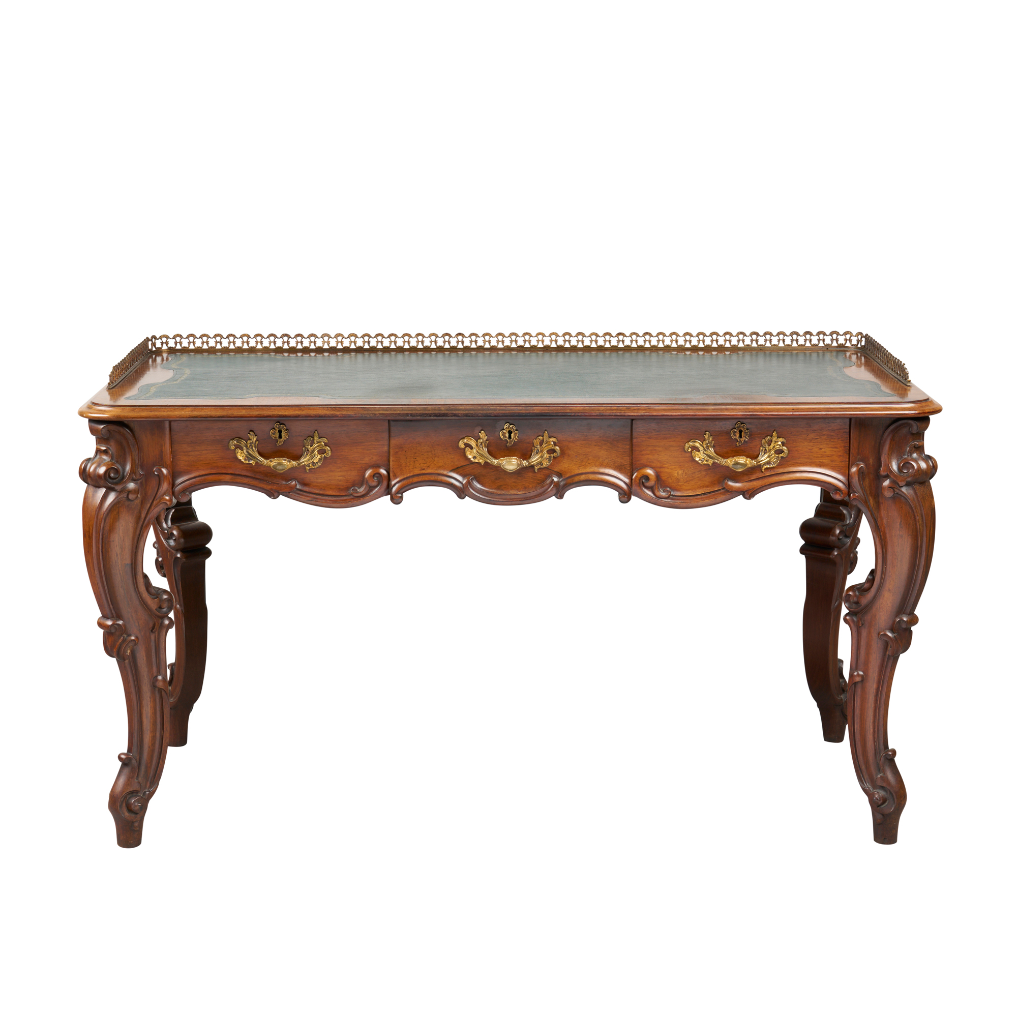 In French manner, the rectangular top with three-quarter pierced brass gallery and lined with gilt-tooled green leather above the shaped frieze with three drawers to one long side and false drawer fronts to the other, raised on carved and moulded cabriole supports, the drawers retaining their original Barron's patent locks, the top of the left-hand drawer front stamped with the maker's name, address (134 Oxford Street, London), and '11805'