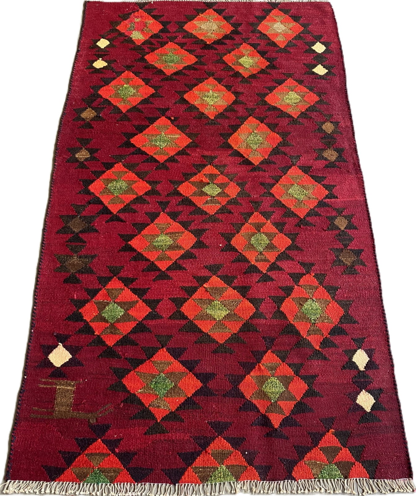 HAND WOVEN WITH WOOL AND NATURAL VEGETABLE DYES WITH TRIBAL DESIGN OF ALL-OVER DIAMOND-SHAPED PATTERNS IN RICH VIBRANT SHADES. HAND WOVEN IN THE PERSIAN FARS PROVINCE.