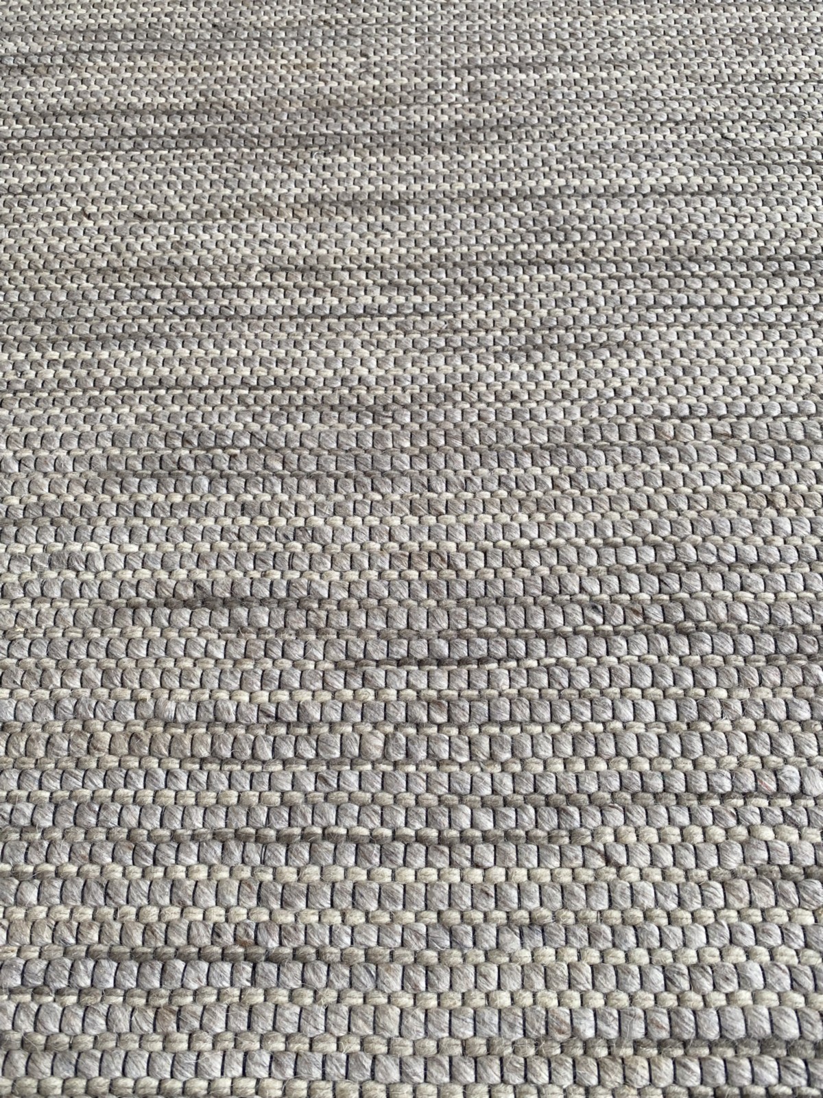 HAND-WOVEN WITH 100% WOOL PILE WITH A BASKET WEAVE DESIGN IN SHADES OF STONE & CREAM.