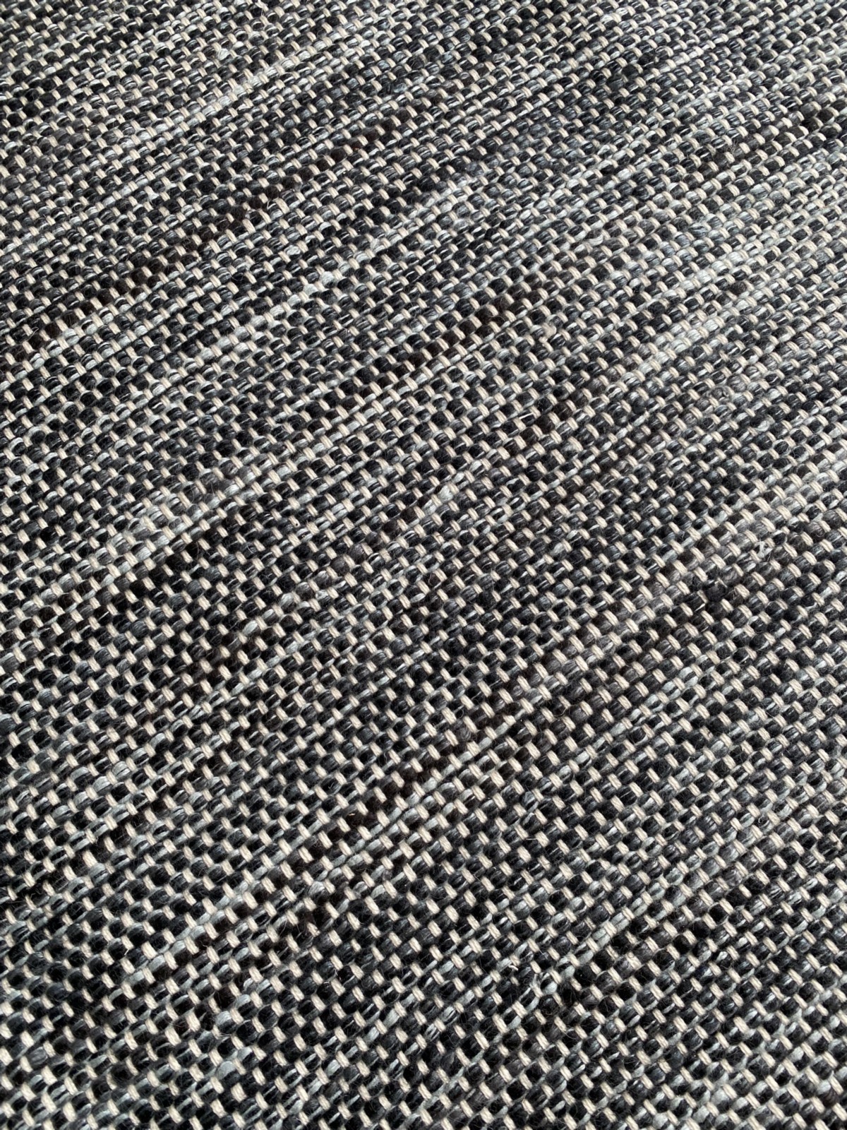 HAND-WOVEN WITH HEAVY WOOL PILE IN SHADES OF CHARCOAL, CREAM & LIGHT BLUE.