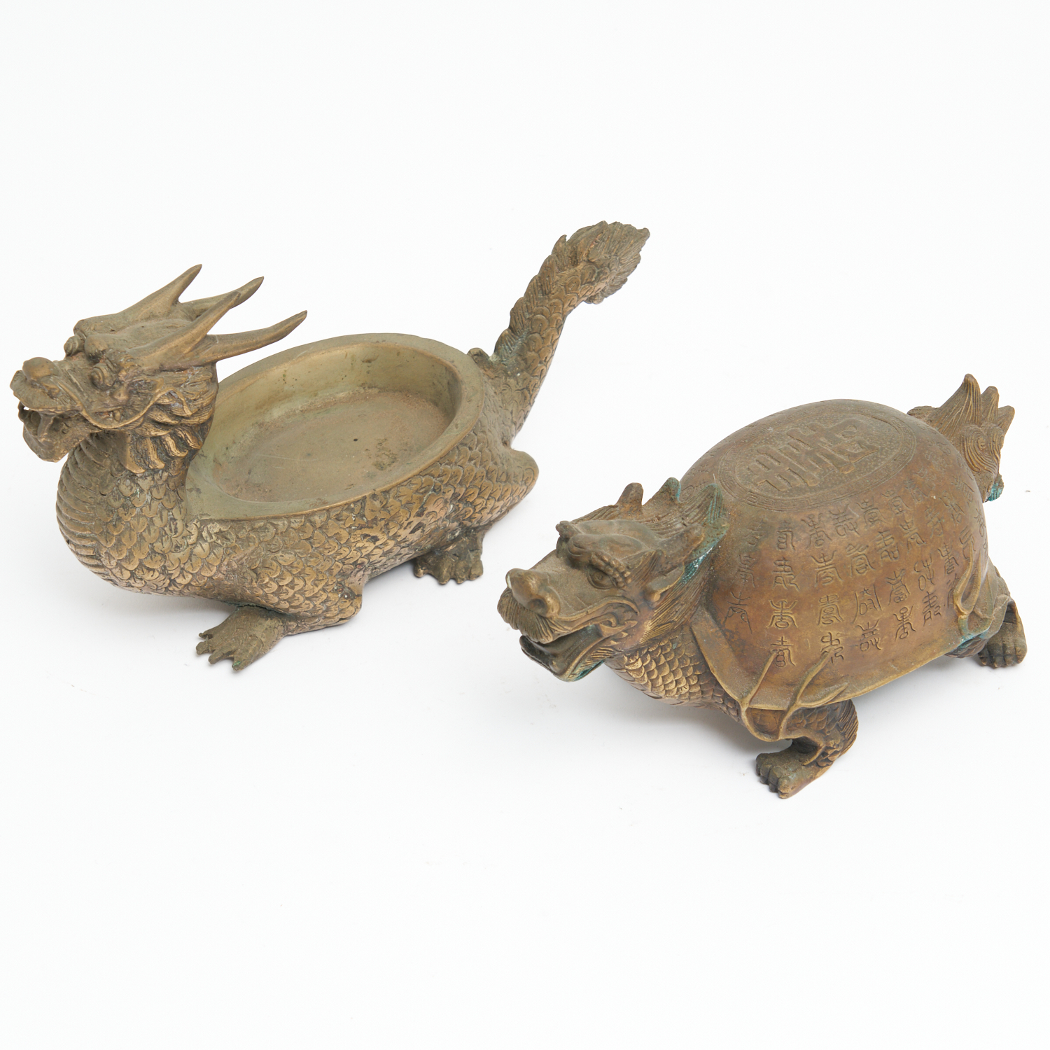 A CHINESE CAST BRONZE LONGGUI (DRAGON TURTLE) TOGETHER WITH A CAST METAL DRAGON-FORM CENSOR H.25CM W.24CM (LARGEST)