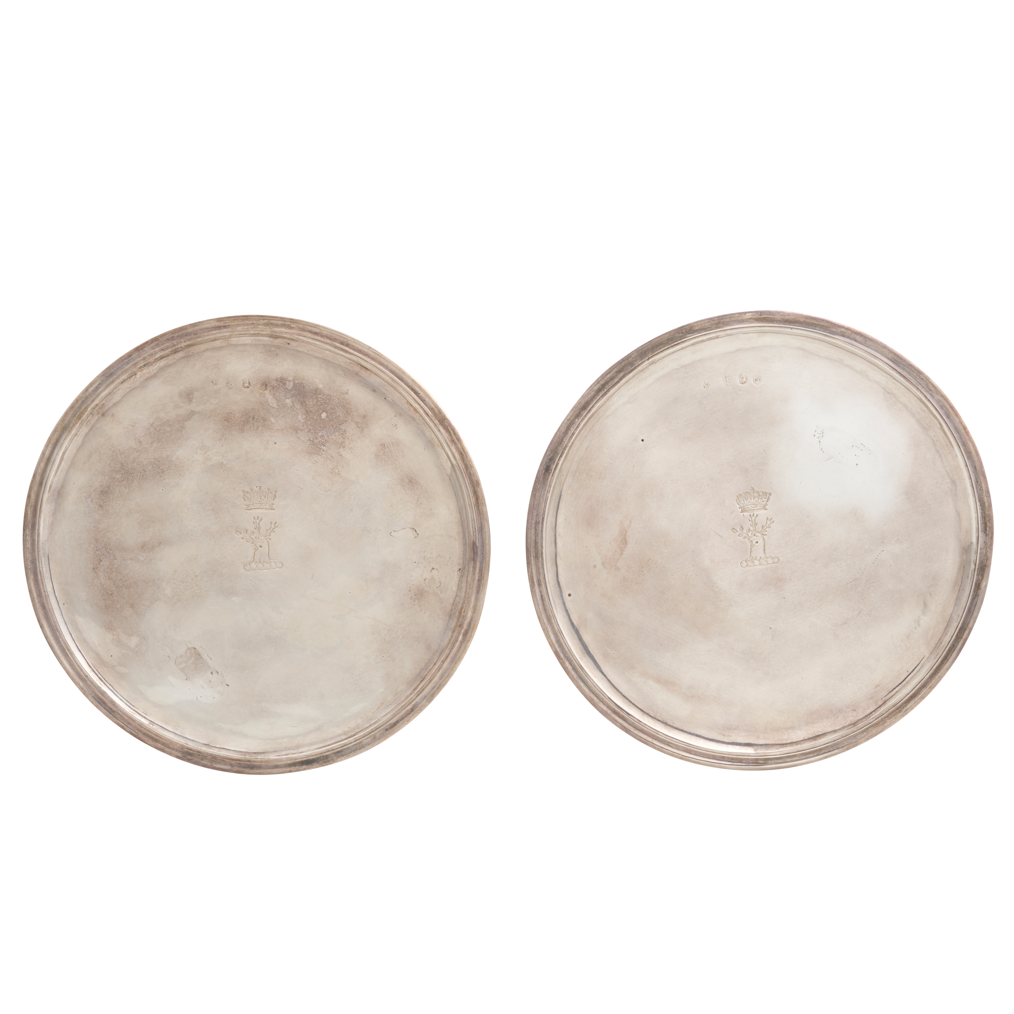 Each circular with a moulded border and raised on a spreading foot, the centre engraved with a crowned couped stag's head crest