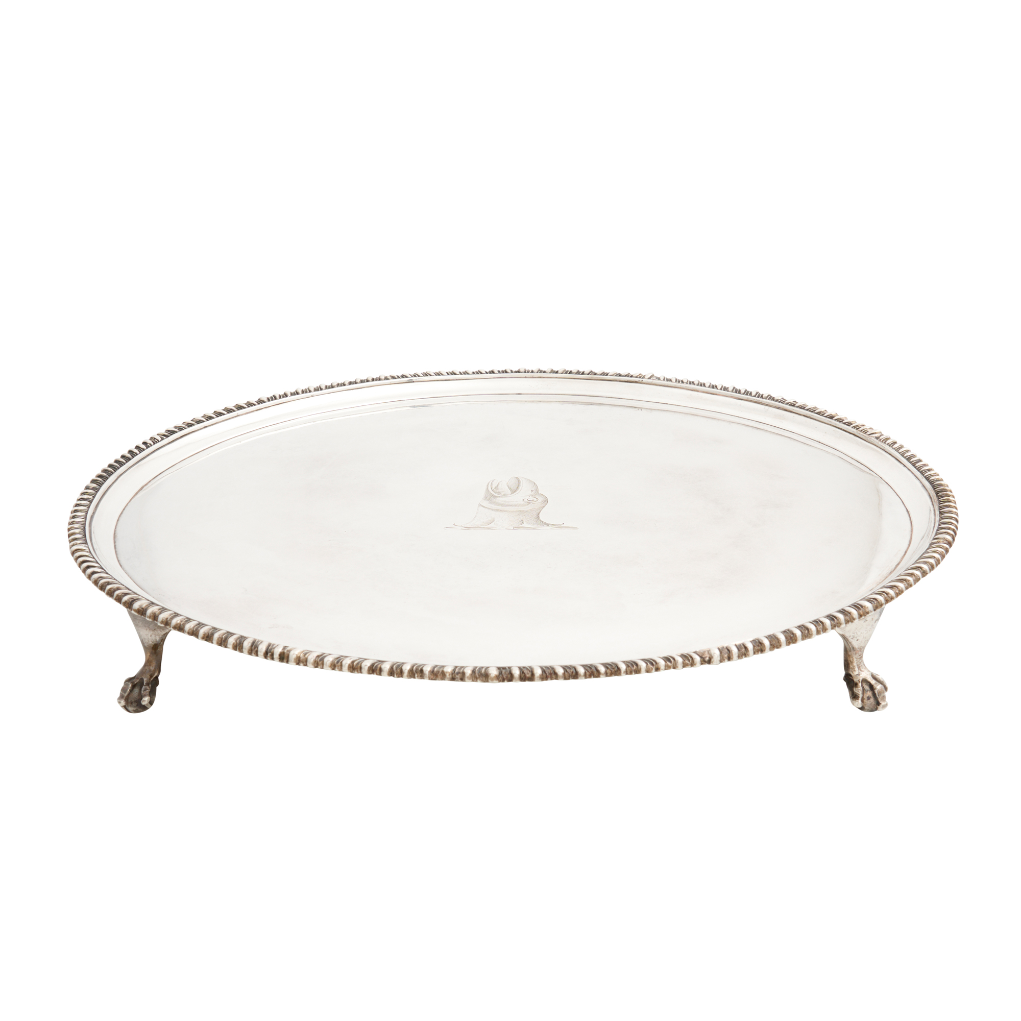 Circular with a gadrooned rim, on four ball and claw feet, the centre engraved with a fish-head crest