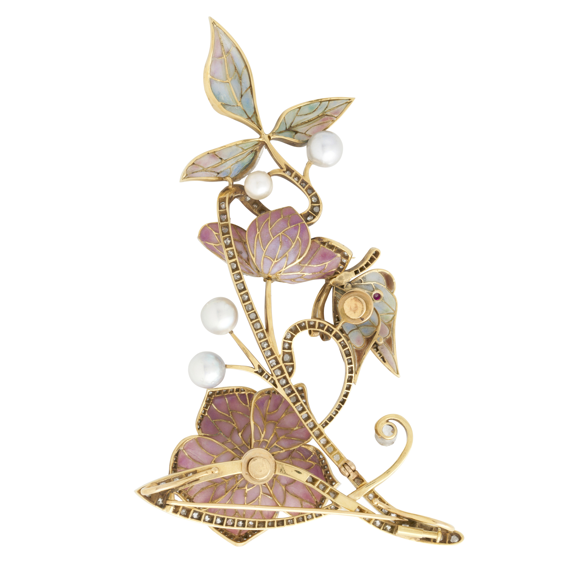 Modelled as a branch, featuring a central flower and butterfly en tremblant and four akoya pearls, the flowers and foliage decorated with plique-à-jour enamel in pink, blue, green and purple tones, the branch and flowers detailed with rubover-set rose and old European-cut diamonds, length 120mm, width 100mm, gross weight approximately 61.2 grams.