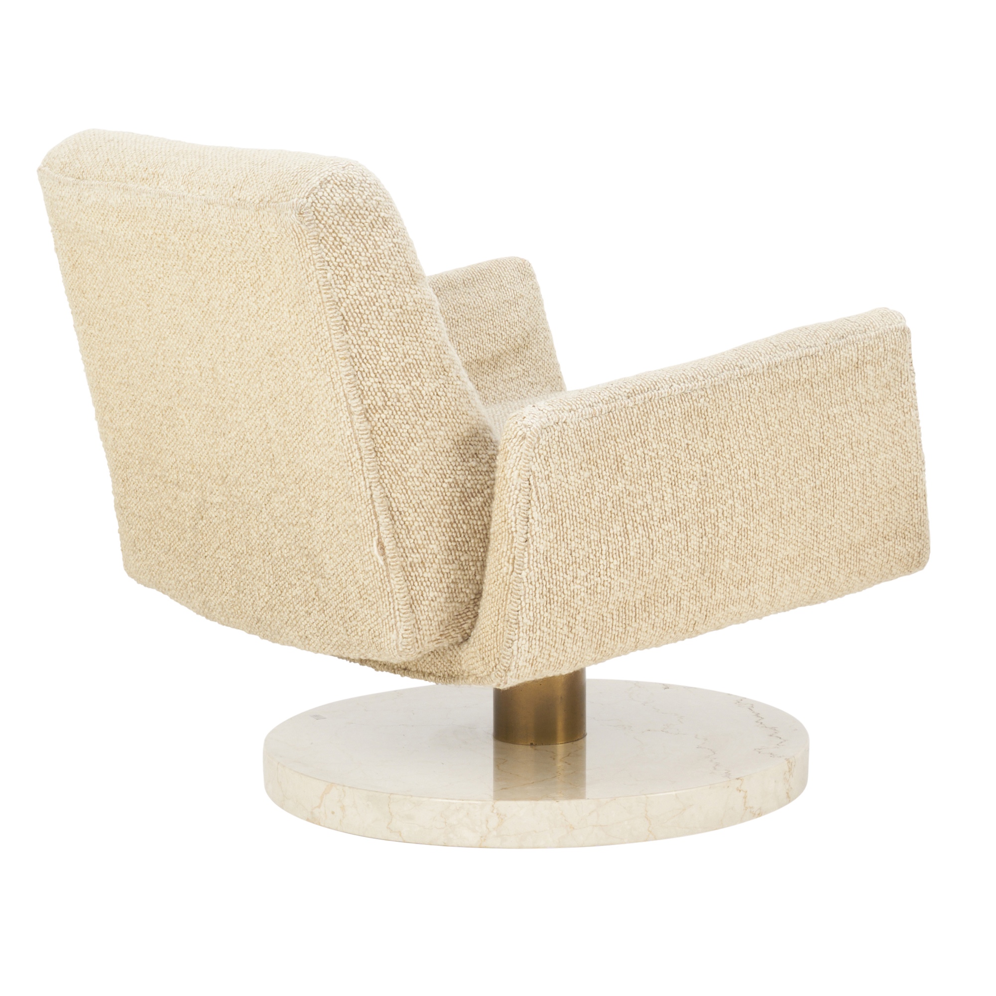 Original cream boucle upholstery on polished brass and solid marble swivel pedestal base.