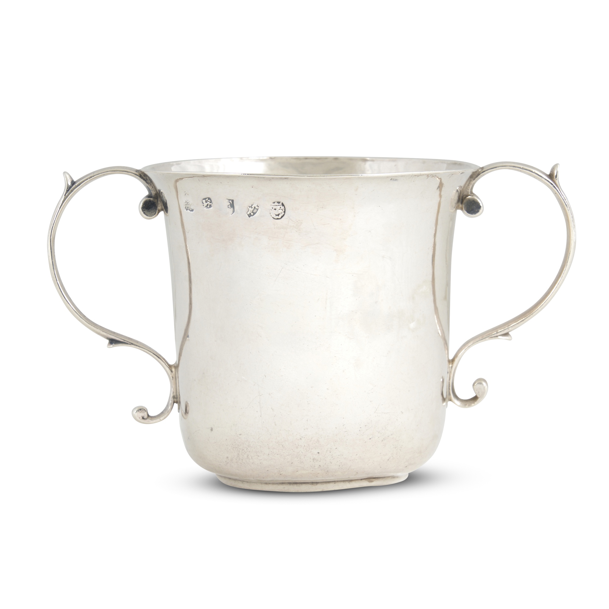 Cup-shaped with slightly everted lip and a pair of scrolling handles, undecorated