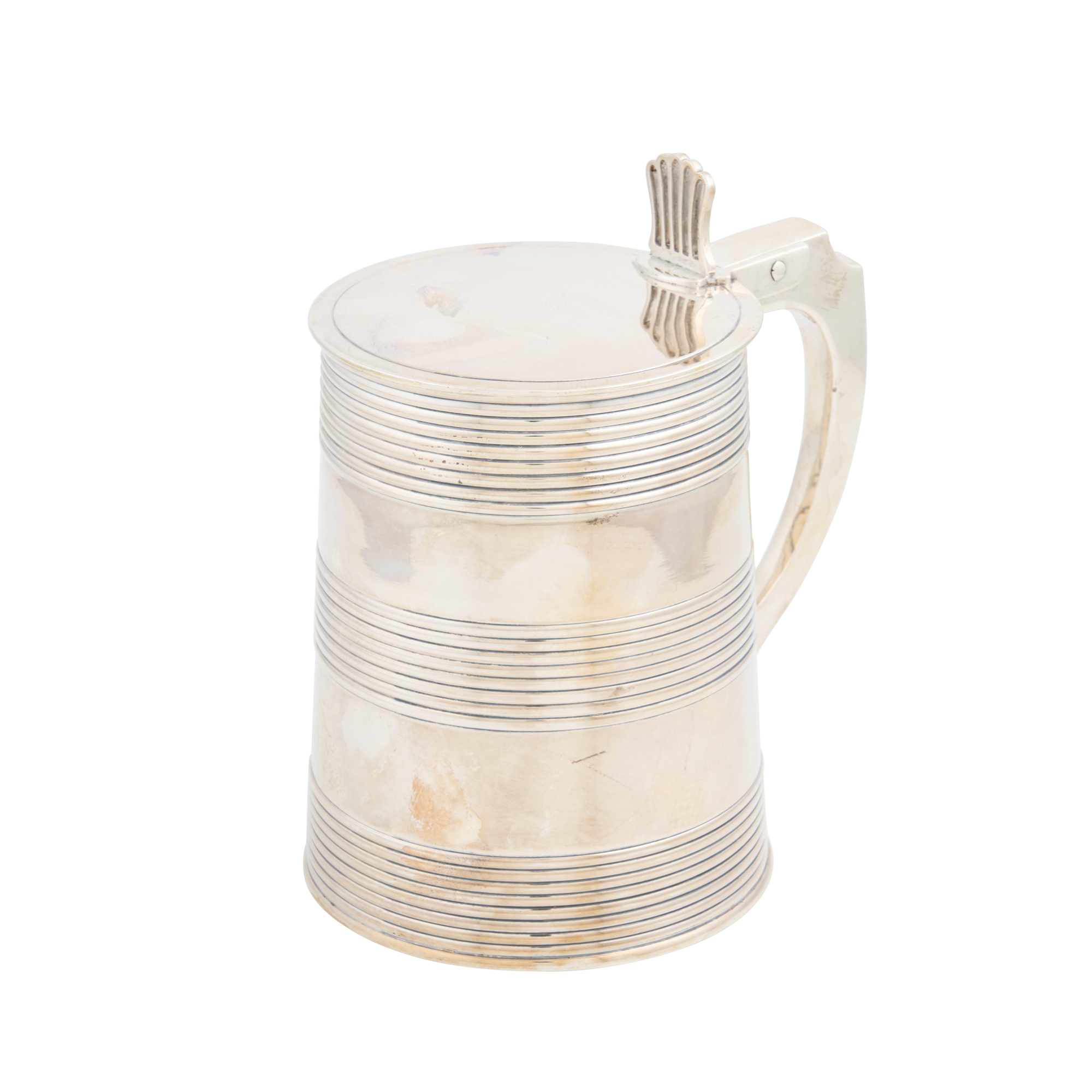 Of spreading cylindrical shape with threed reeded bands and a shaped handle, the hinged flat cover with a shaped thumbpiece