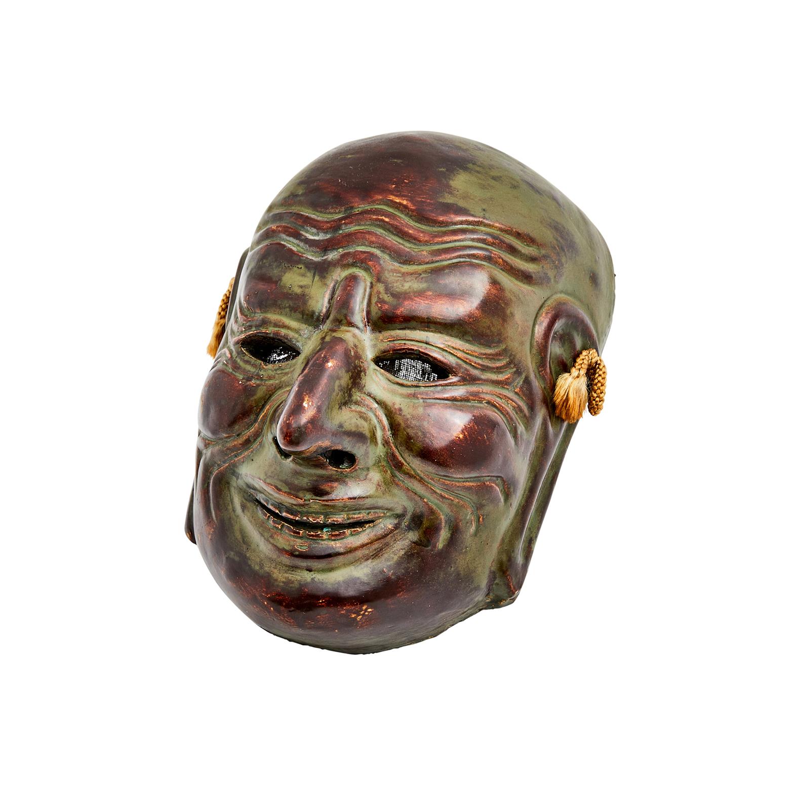 Depicting an elderly man in the traditional Gigaku manner, constructed from painted plaster with netted cloth lining.
