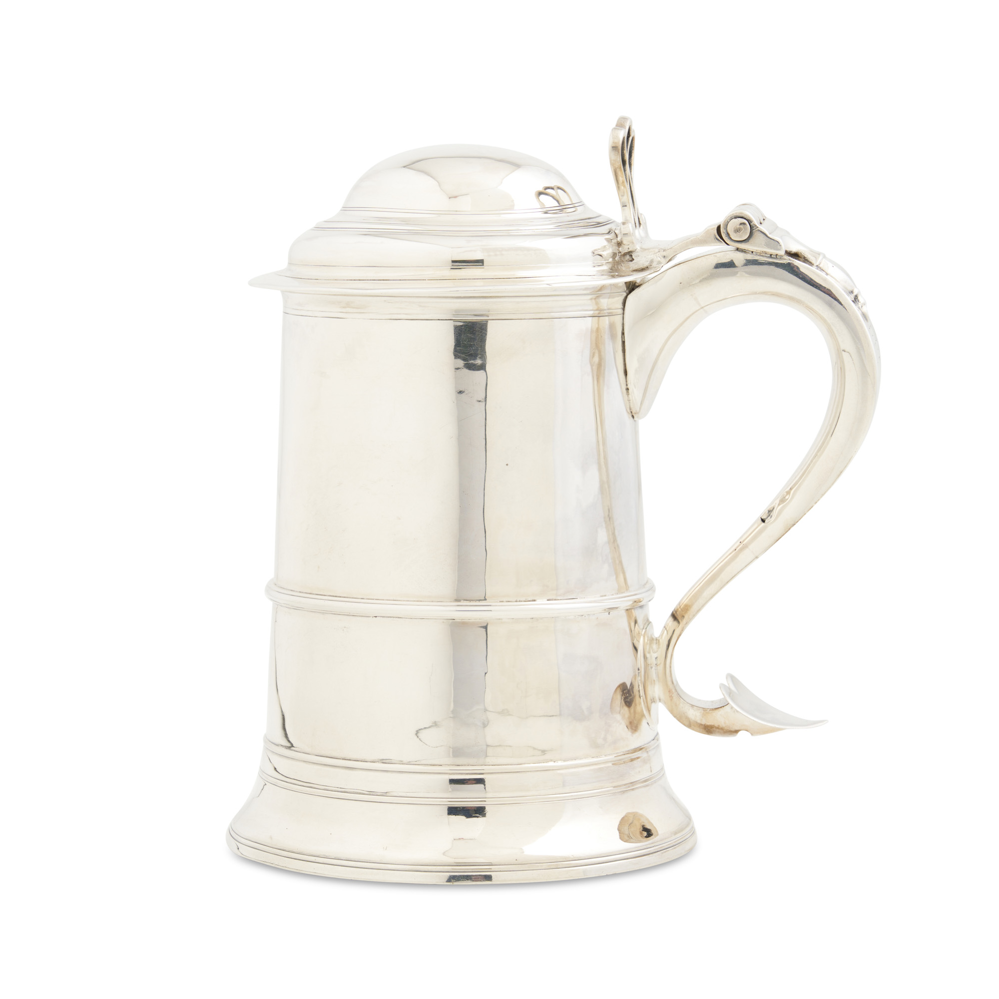 The spreading cylindrical girdled body on a moulded foot with a domed cover, the scrolling handled with a pierced thumbpiece and heart-shaped terminal, the handle engraved with initials H above C . E