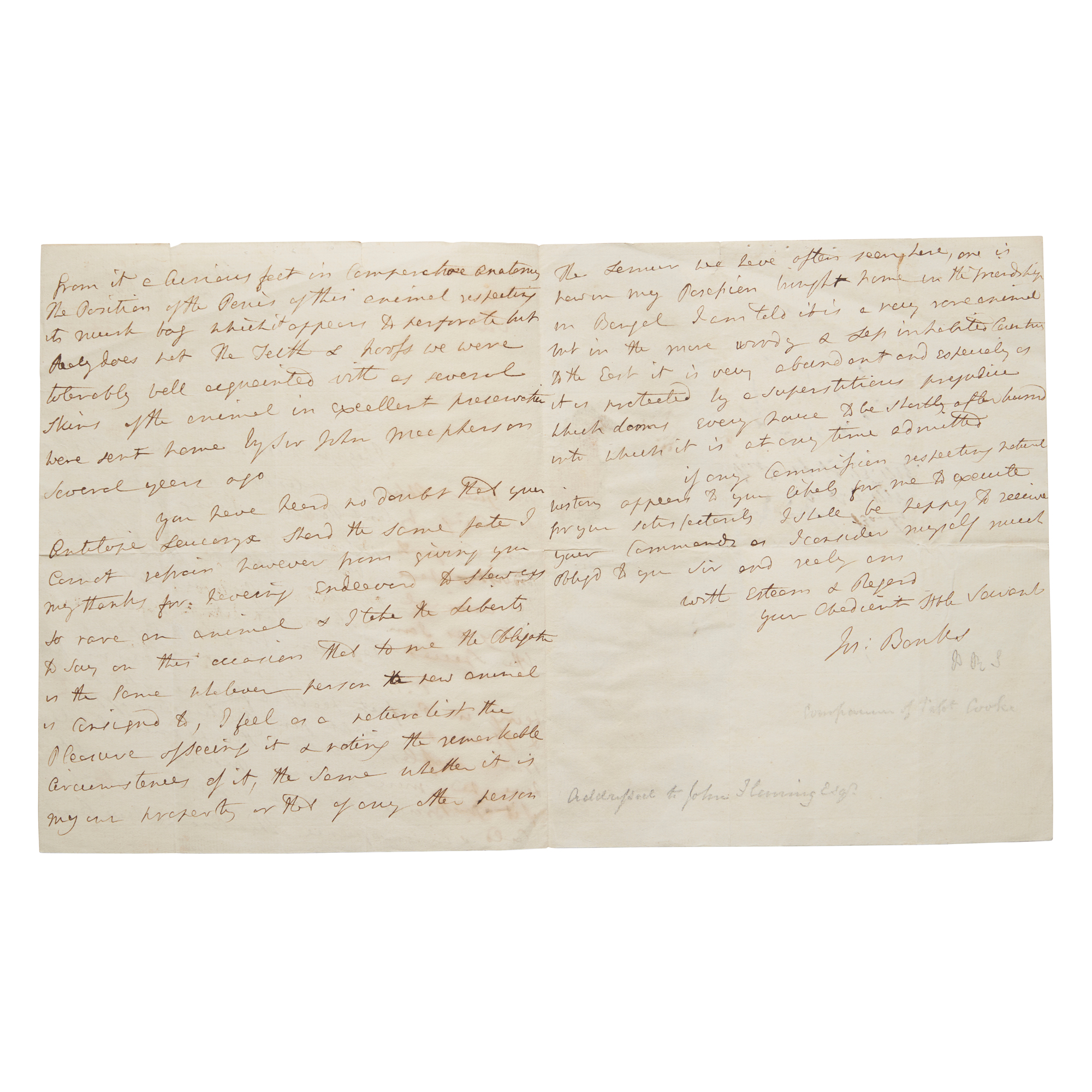 A letter to an unnamed addressee, apparently John Fleming, beginning: 'Sir, I beg you to accept my best thanks for your obliging intentions towards me in forwarding by […?] a living musk animal. I am writing to inform you that your obliging good wishes have been disappointed by the death of the animal which is a grievous loss to Natural History as I am certain that hitherto no animal of the species has been brought to England.'