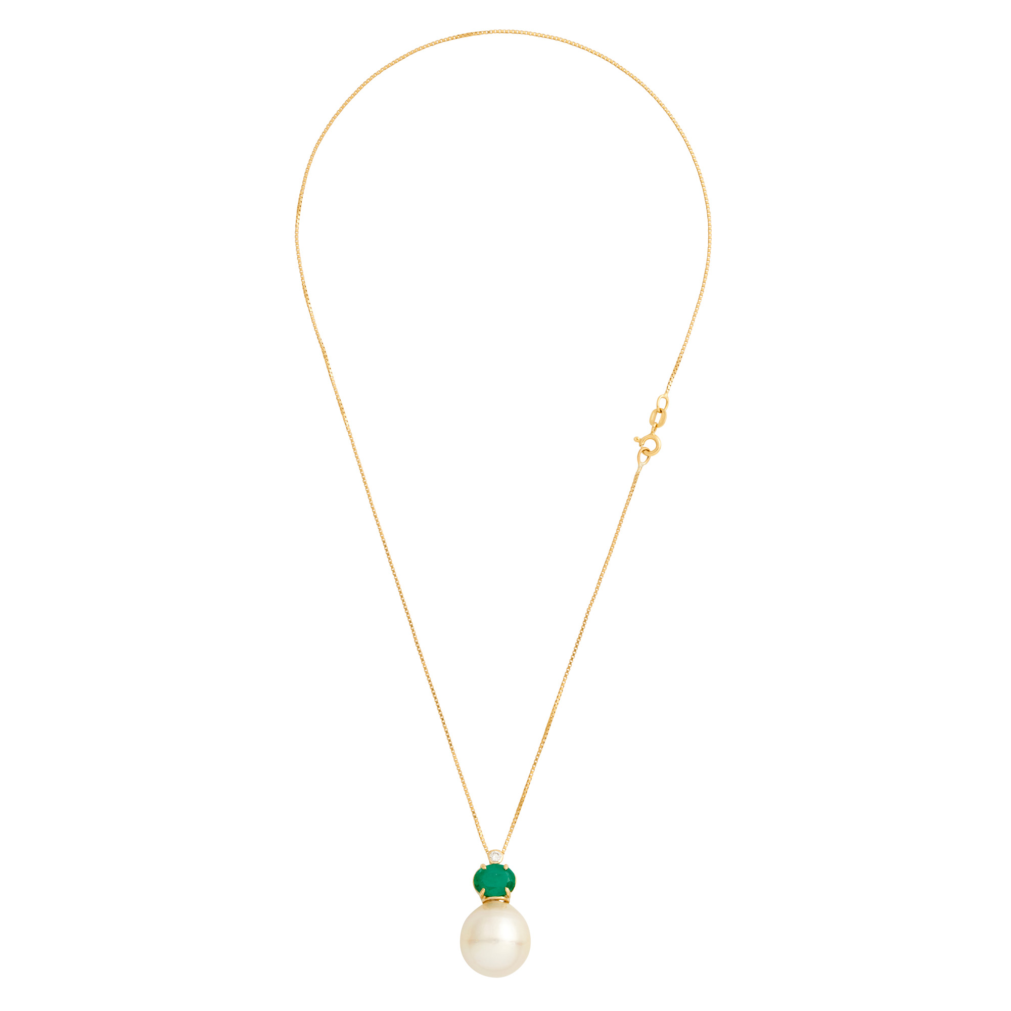 A SOUTH SEA PEARL AND EMERALD PENDANT IN 18CT GOLD, THE PEARL MEASURING 15.2MM X 17MM, THE EMERALD WEIGHING 1.68CTS, TOTAL LENGTH 430MM, 9.3GMS