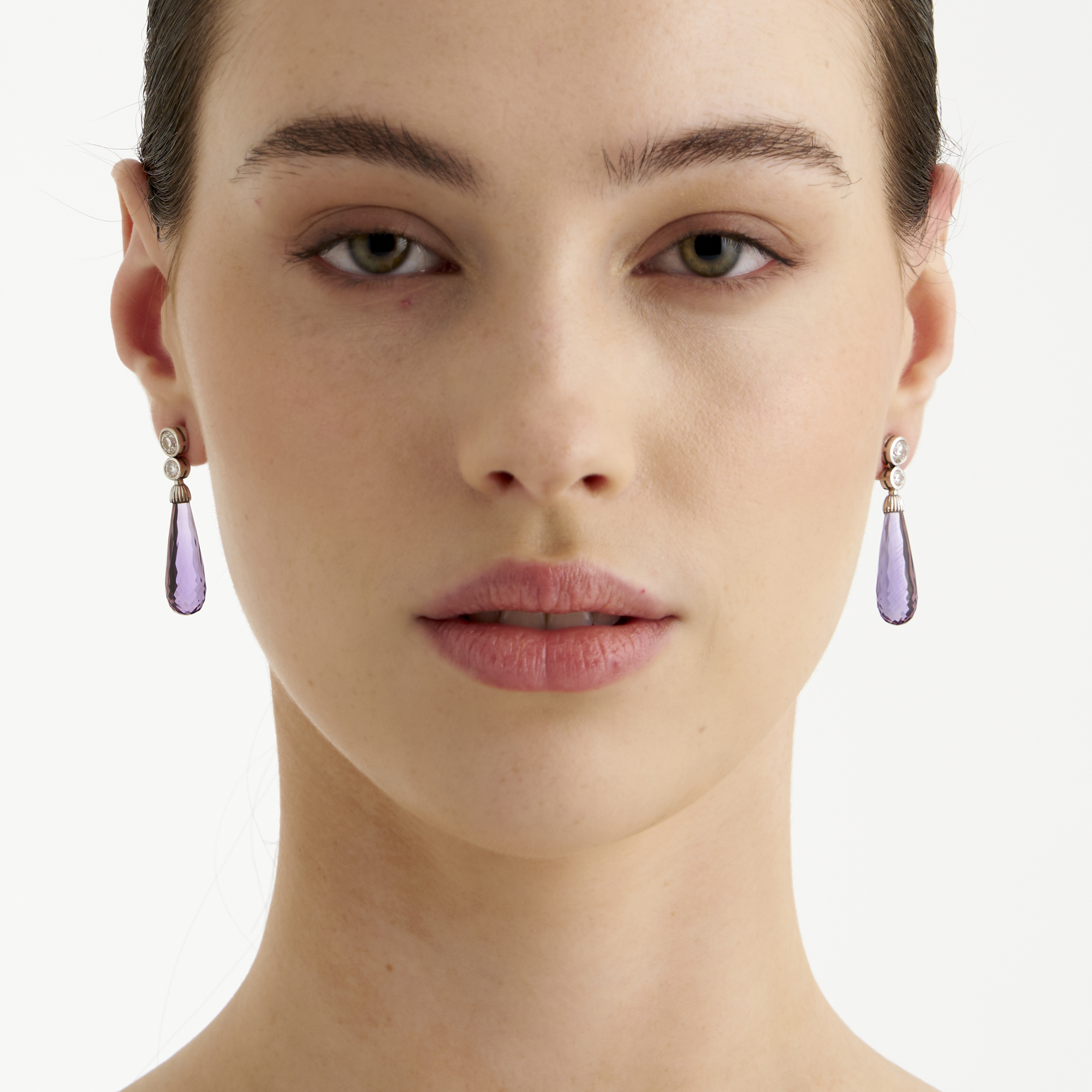 Each earring comprising a briolette-cut amethyst drop suspended below two bezel-set round brilliant-cut diamonds, the diamonds together weighing approximately 1.00 carat, to post and butterfly fittings, length 40mm, gross weight approximately 8.3 grams.
