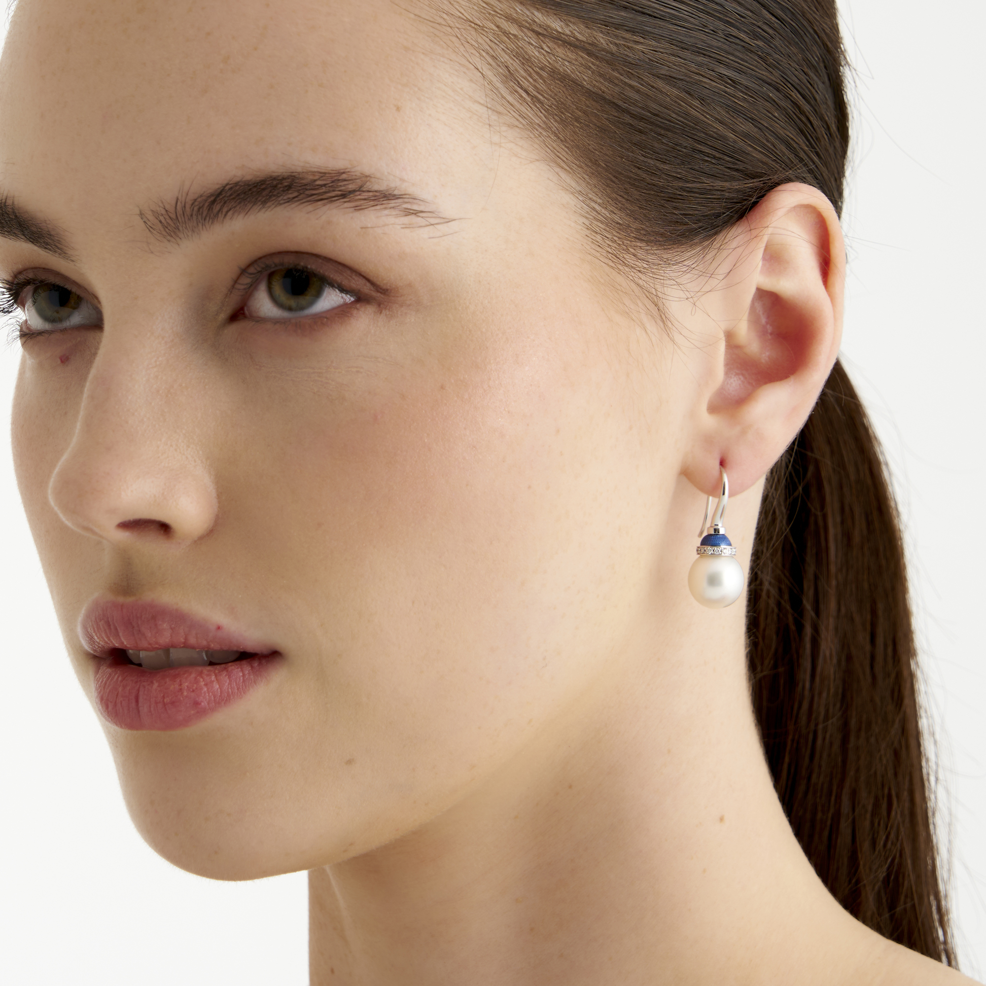 Each earring comprising a round pearl of white hues measuring approximately 11.0mm to 12.0mm with a blue guilloché enamel and brilliant-cut diamond cap, the diamonds together weighing 0.21 carats, to shepherd hook fittings, signed Kailis, length 30mm, gross weight approximately 9.6 grams.