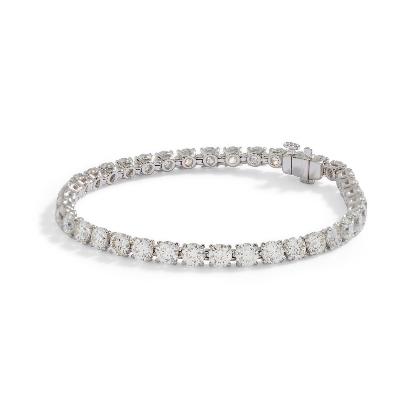 Composed of a line of 38 claw-set round brilliant-cut diamonds completed by a concealed box clasp, the diamonds together weighing 11.60 carats, mounted in 18ct white gold, length 175mm.