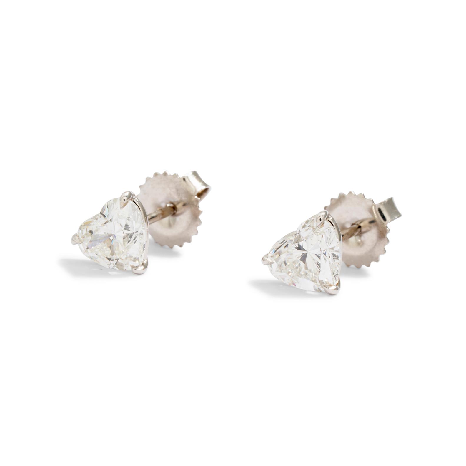 The heart-shaped brilliant-cut diamonds weighing 1.02 carats and 1.00 carats respectively, are claw-set, mounted in 18ct white gold, post and scroll fittings.