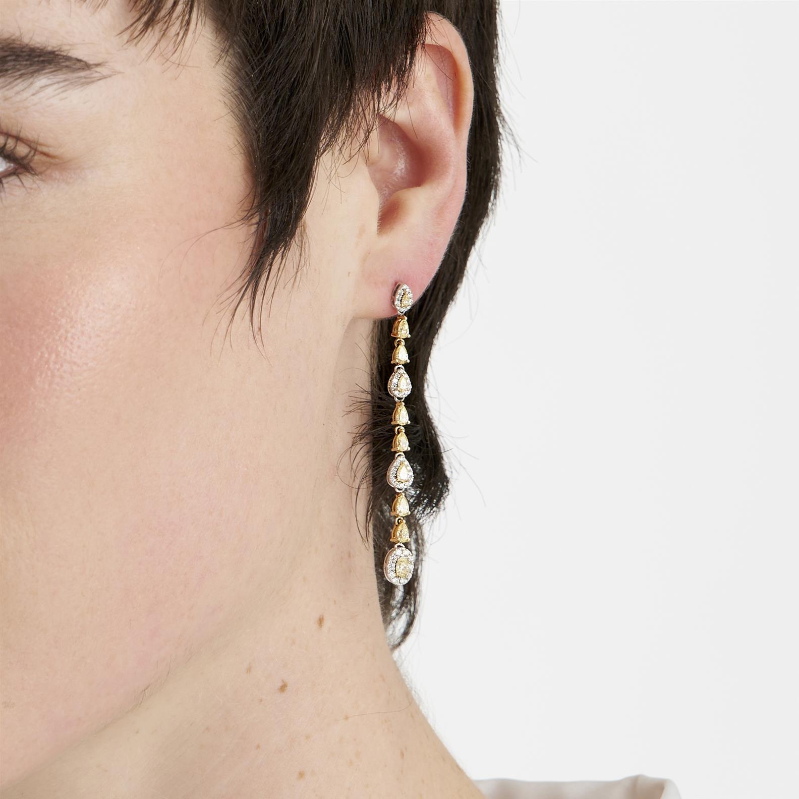 Each composed of a line of clusters claw-set with variously-cut natural fancy yellow oval and pear-shape diamonds framed by a halo of brilliant-cut diamonds between near colourless claw-set pear-shaped diamond connectors, the diamonds together weighing approximately 2.38 carats, mounted in 14ct two tone gold, post and scroll fitting, length 59mm.