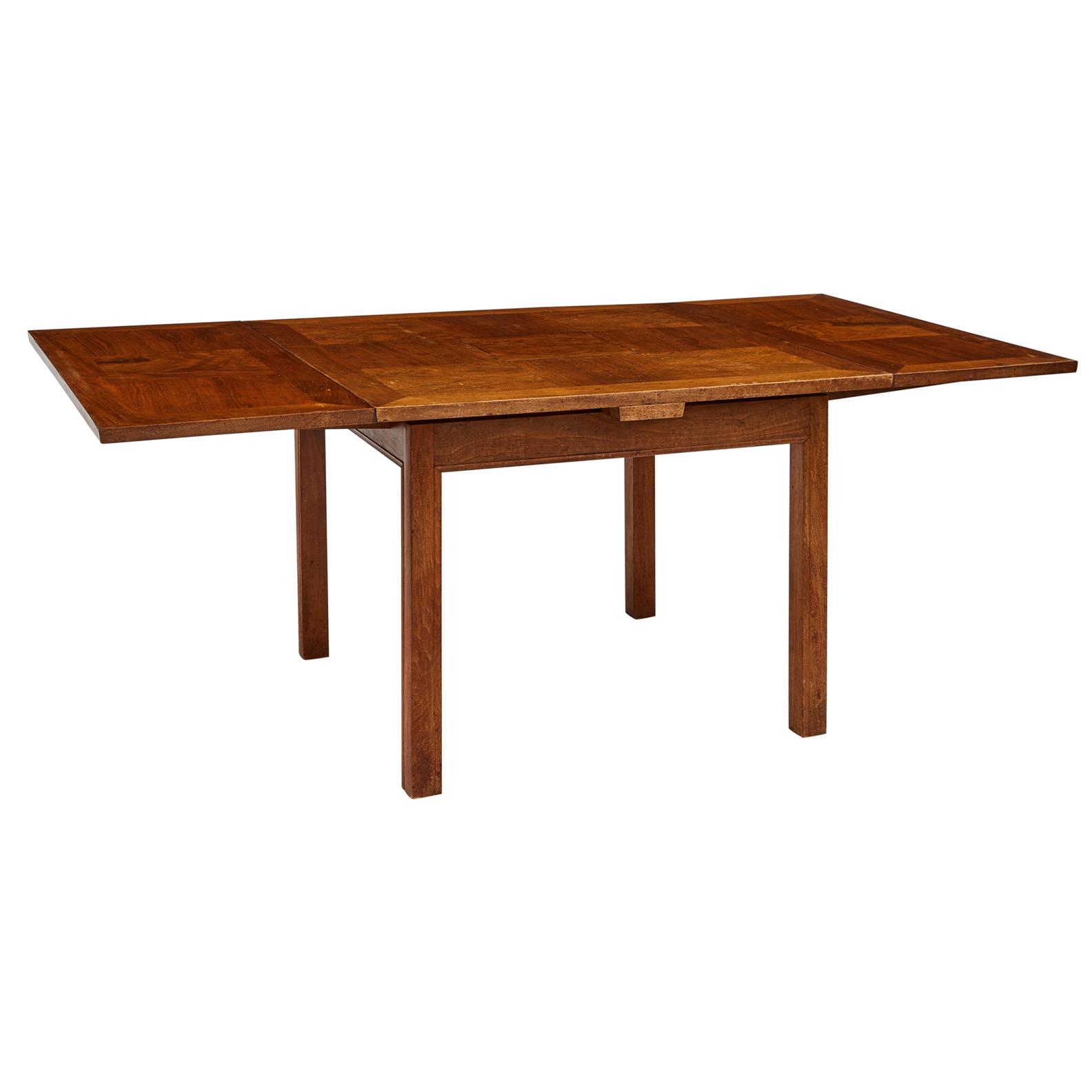 Dated 1931, design no. 961, the parquetry top with sliding leaf extensions, on square moulded legs, with original paper label to underside listing: Designer: R. D. Russell, Foreman: P. J. Wade, Cabinet Maker: H. Allaway and A. Hermsen.