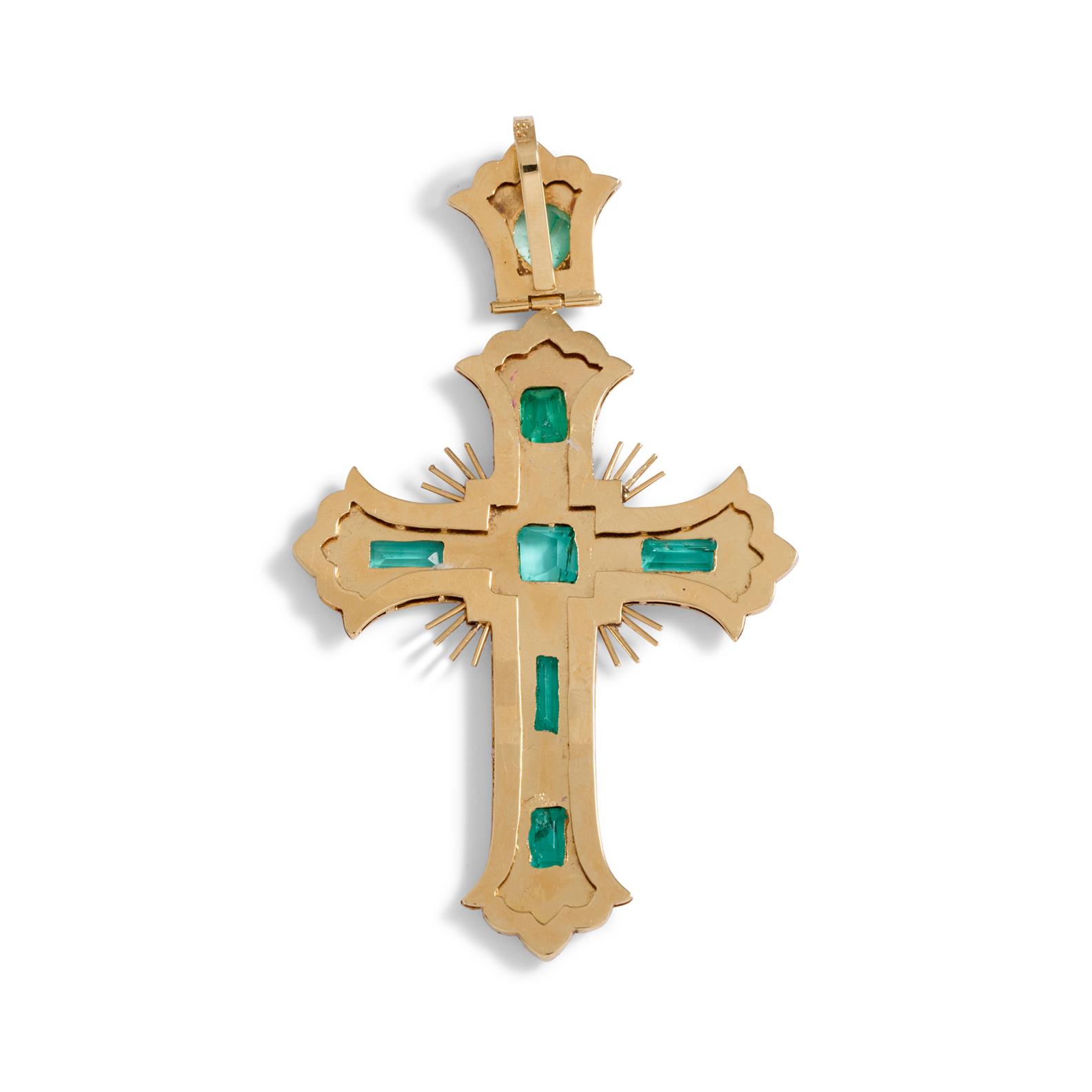 Designed as a Byzantine cross bezel set with one pear-shaped and six rectangular shaped emeralds, gross weight 10.60 grams, length 70mm, width 43mm.