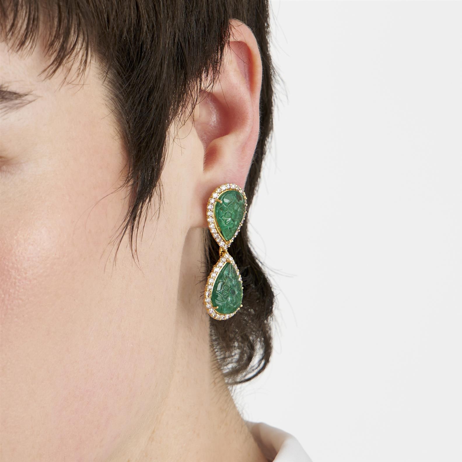 Each terminating on a pear-shaped swing drop bezel set with a carved emerald framed by a diamond halo supported from a similarly shaped surmount between a claw-set diamond connector, the emeralds and diamonds together weighing approximately 16.54 carats and 2.74 carats respectively, mounted in 18ct gold, length 41mm.