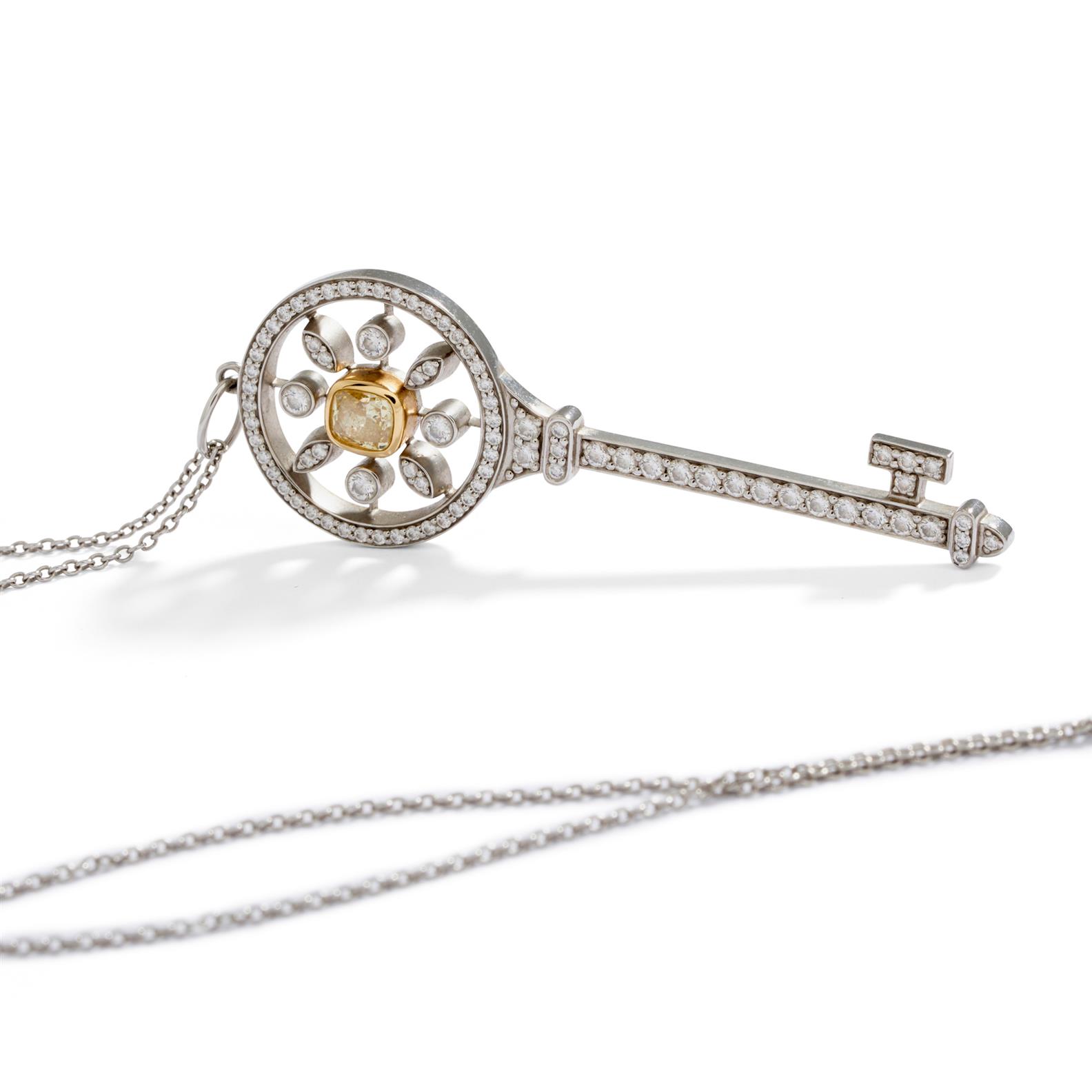 Designed as a stylised key, centring an openwork starburst, the centre collet-set with a cushion-shaped natural fancy intense yellow diamond weighing approximately 0.40 carats, further decorated by near colourless brilliant-cut diamonds together weighing approximately 0.65 carats, completed by a trace chain, mounted in 18ct gold and platinum, pendant length 50mm, inner circumference 500mm, pendant numbered, signed Tiffany & Co.
