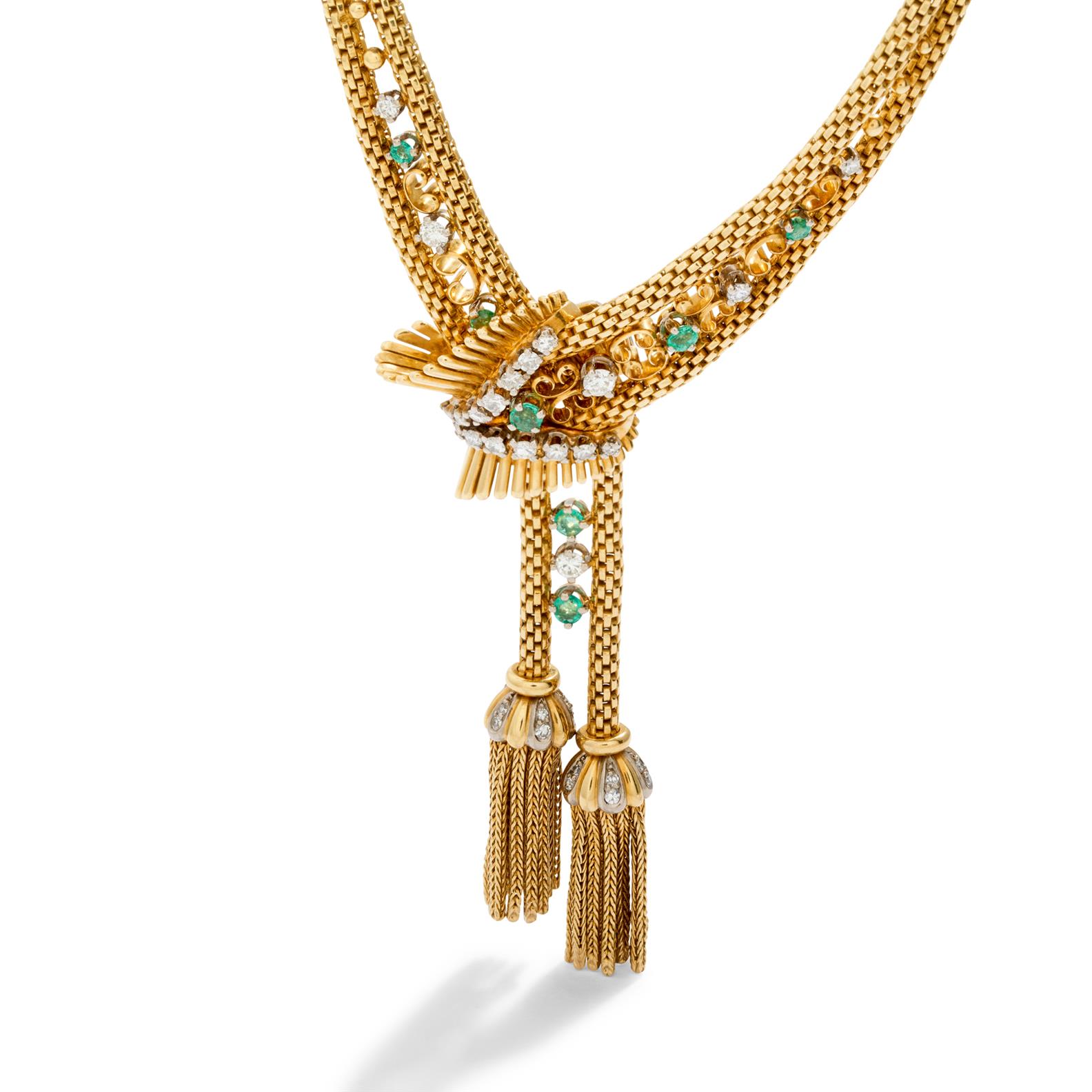 Composed of two round chain mesh necklaces decorated to the front with claw set circular cut emeralds and brilliant-cut diamonds between a geometric motif clasp terminating on a pair of multi strand tassels supported from a bell cap accented with diamonds 65.2gms, inner circumference 400mm, signed S.F.; P*G.