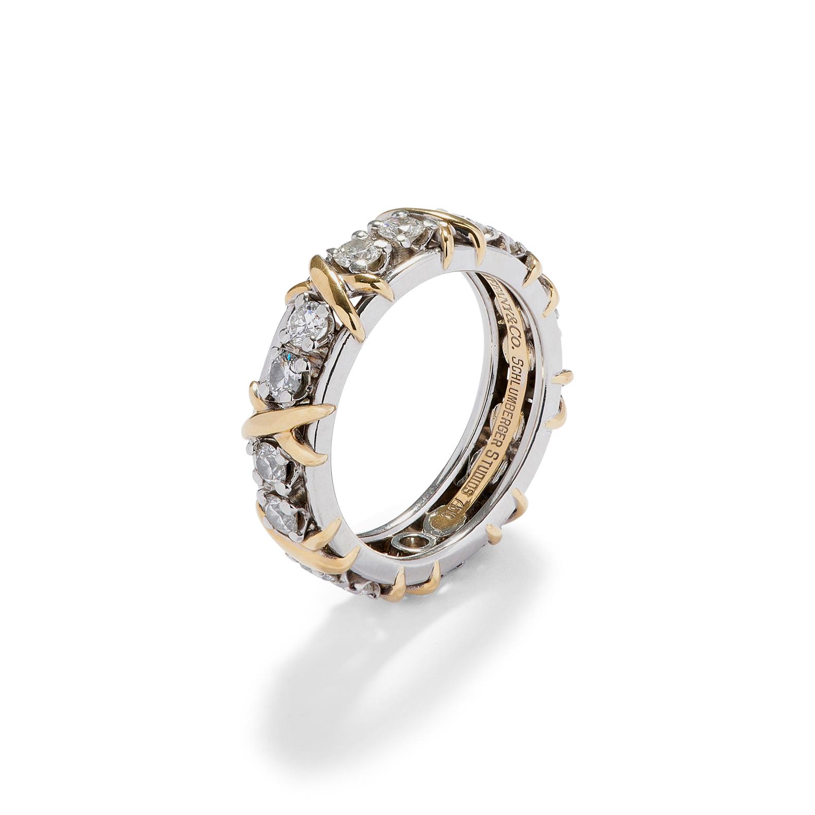 Designed as a continuous line of eight pairs of brilliant-cut diamonds between 18ct gold 'X' shaped wire motifs, the diamonds together weighing approximately 1.14 carats, mounted in platinum and 18ct gold, size L1/2, signed Tiffany & Co., Schlumberger Studios.