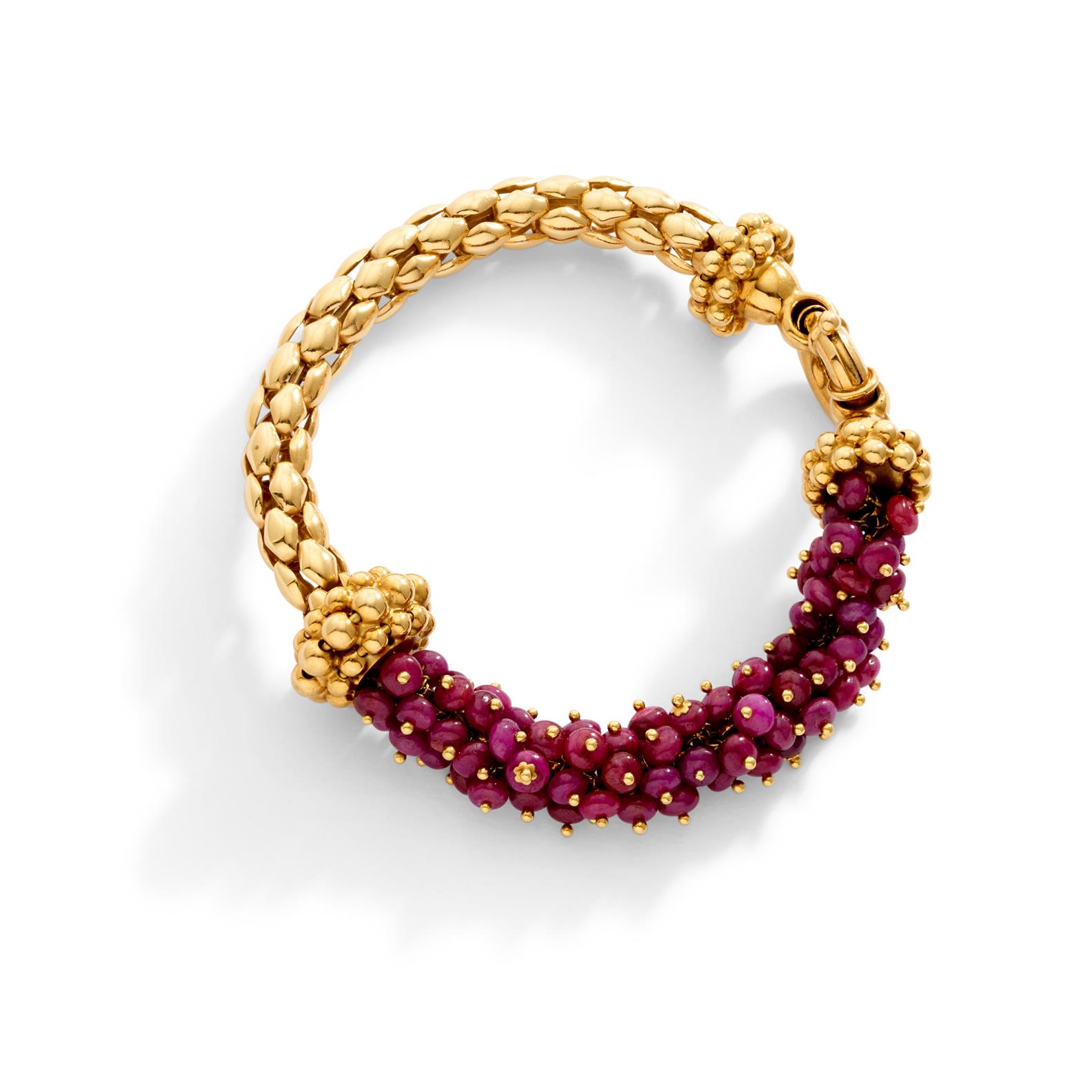 Of split design, composed of a cluster of spherical ruby beads with gold terminals completed by openwork spherical chain composed of half round brick-links to openwork bolt clasp, inner circumference 185mm, Italian marks.