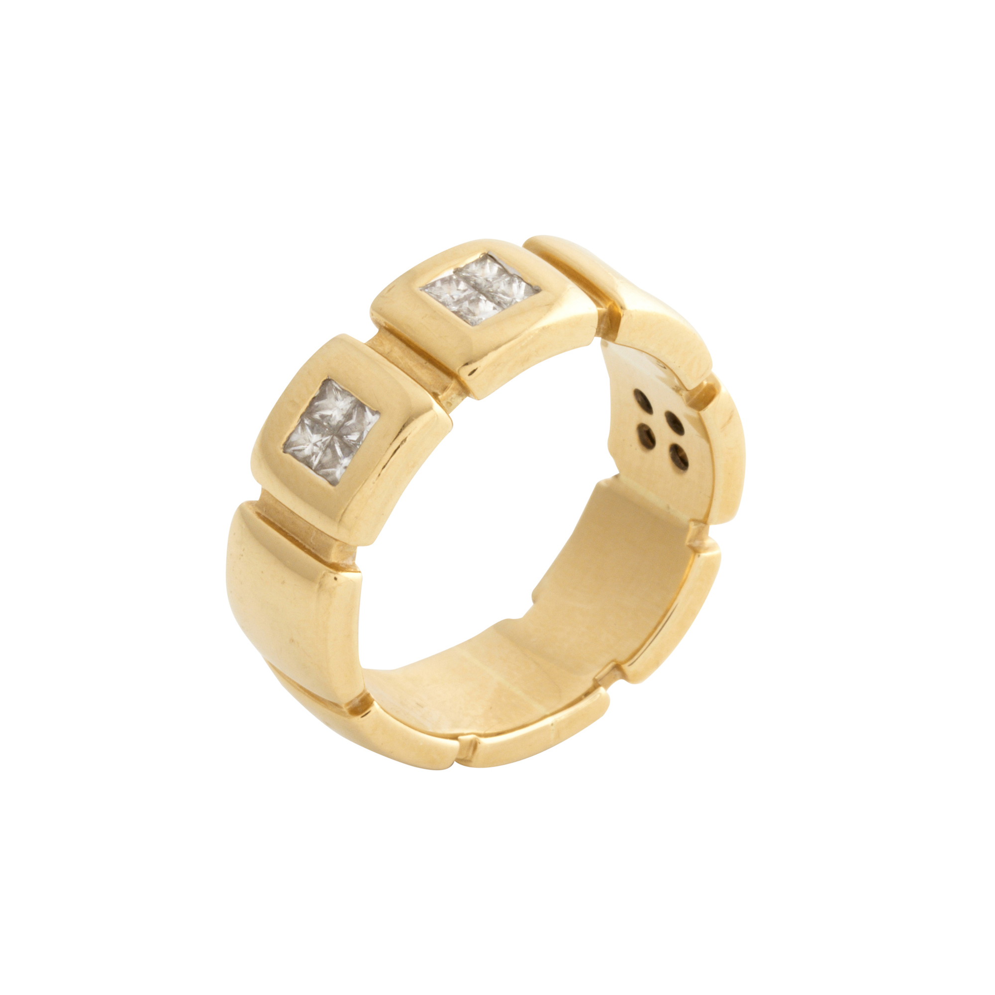 Styled as a full circle of geometric panels, the top four panels centring a cluster of invisible-set princess-cut diamonds, the diamonds together weighing approximately 0.80 carats size Q, gross weight approximately 10.2 grams.