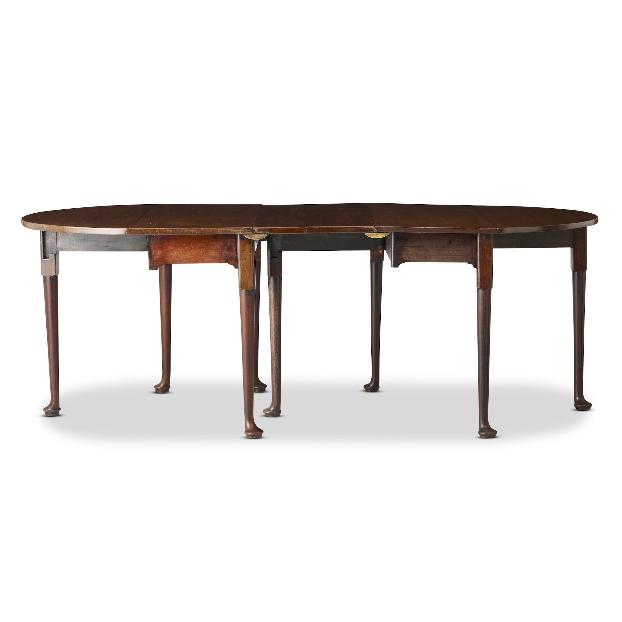 In three sections, the two end sections each with a single semicircular drop-leaf, the central section with a drop-leaf each side, together with a further spare leaf, raised on turned supports with pad feet