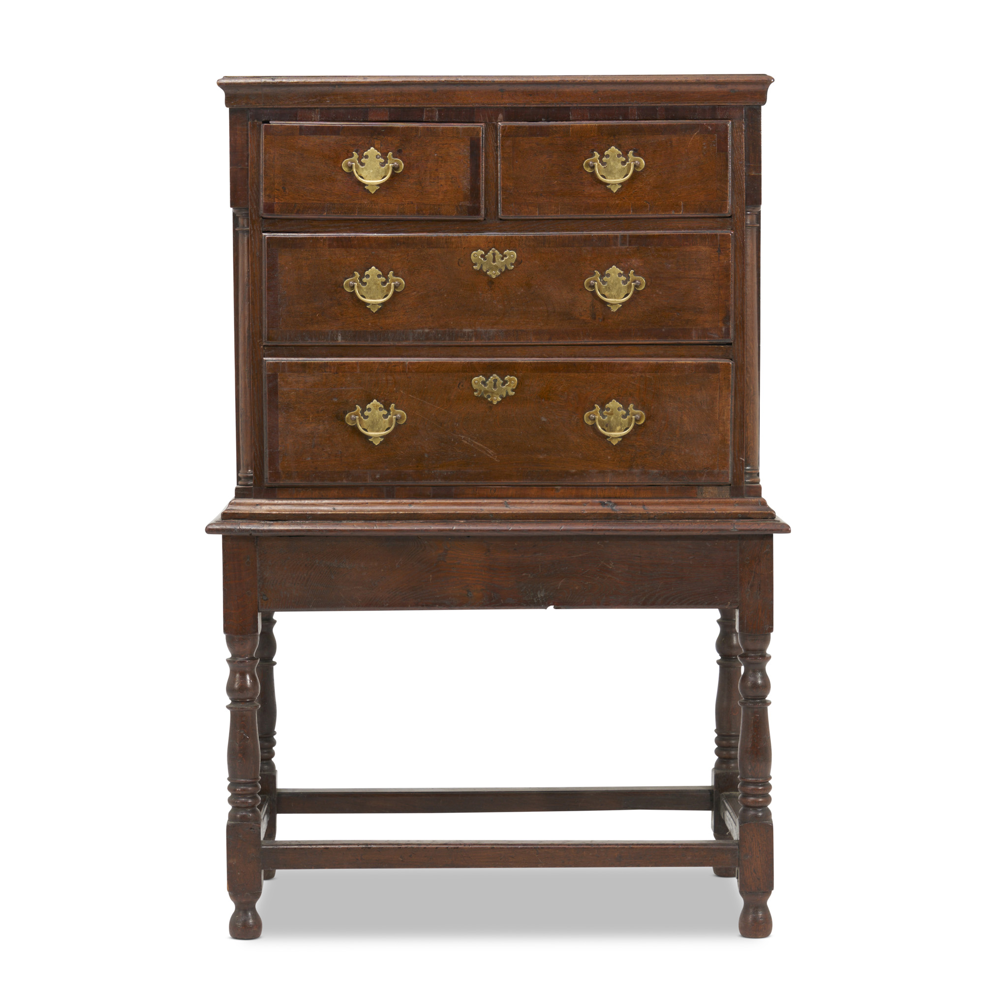 The chest with a moulded cornice above two short and two long drawers between quarter-columns at the front corners, the top and drawer fronts cross-banded in walnut, the stand on turned supports joined by peripheral stretchers