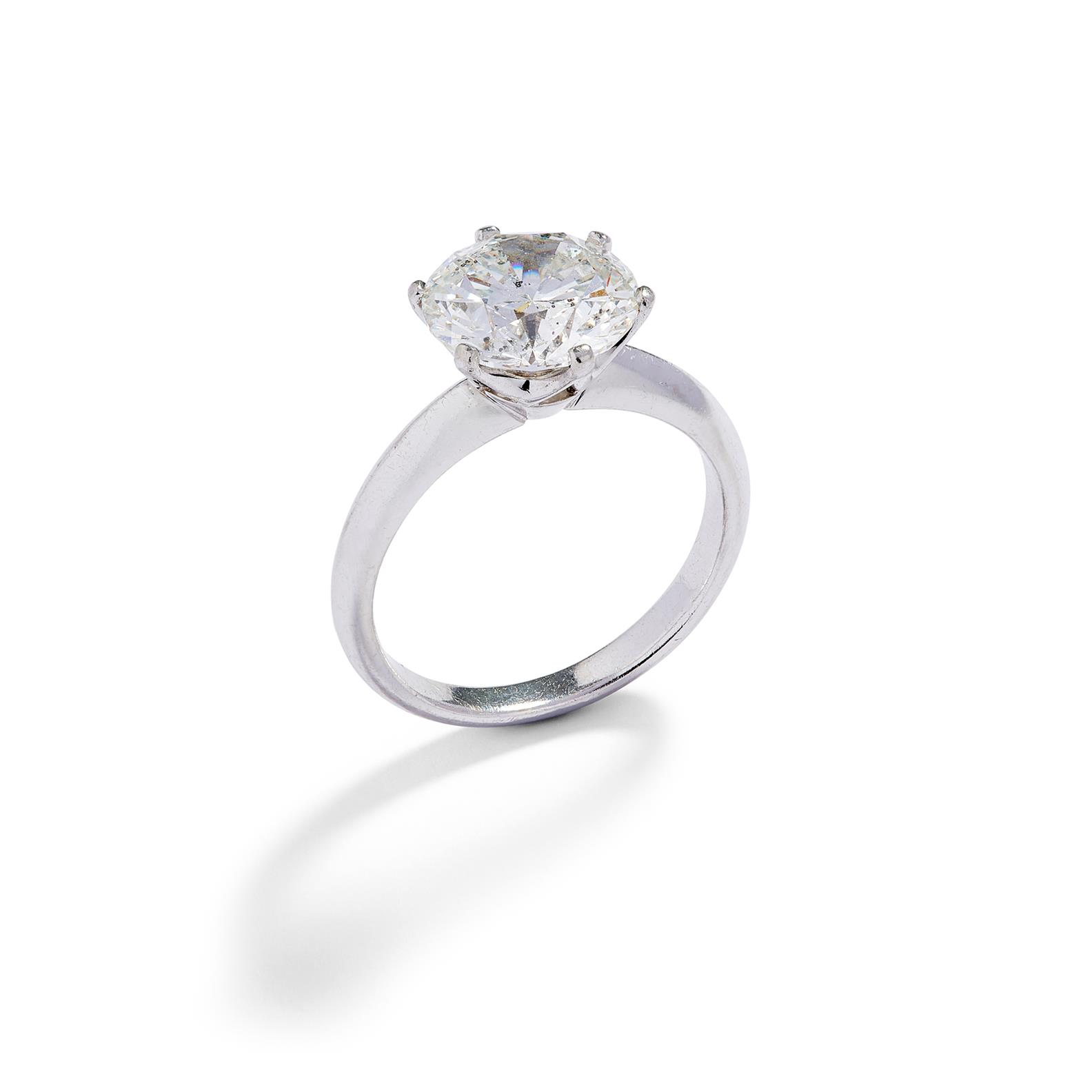 Centring a claw-set round brilliant-cut diamond weighing 4.31 carats, mounted in platinum, size Q.