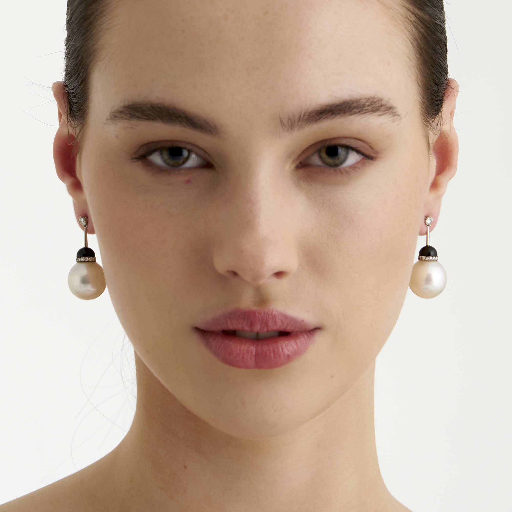 Each earring featuring a round pearl of white hues measuring approximately 16.5mm, to an onyx and round brilliant-cut diamond cap, suspended from a bar drop and claw-set brilliant-cut diamond surmount, the diamonds together weighing approximately 0.40 carats, to post and butterfly fittings, length 35mm, gross weight approximately 18.4 grams.
