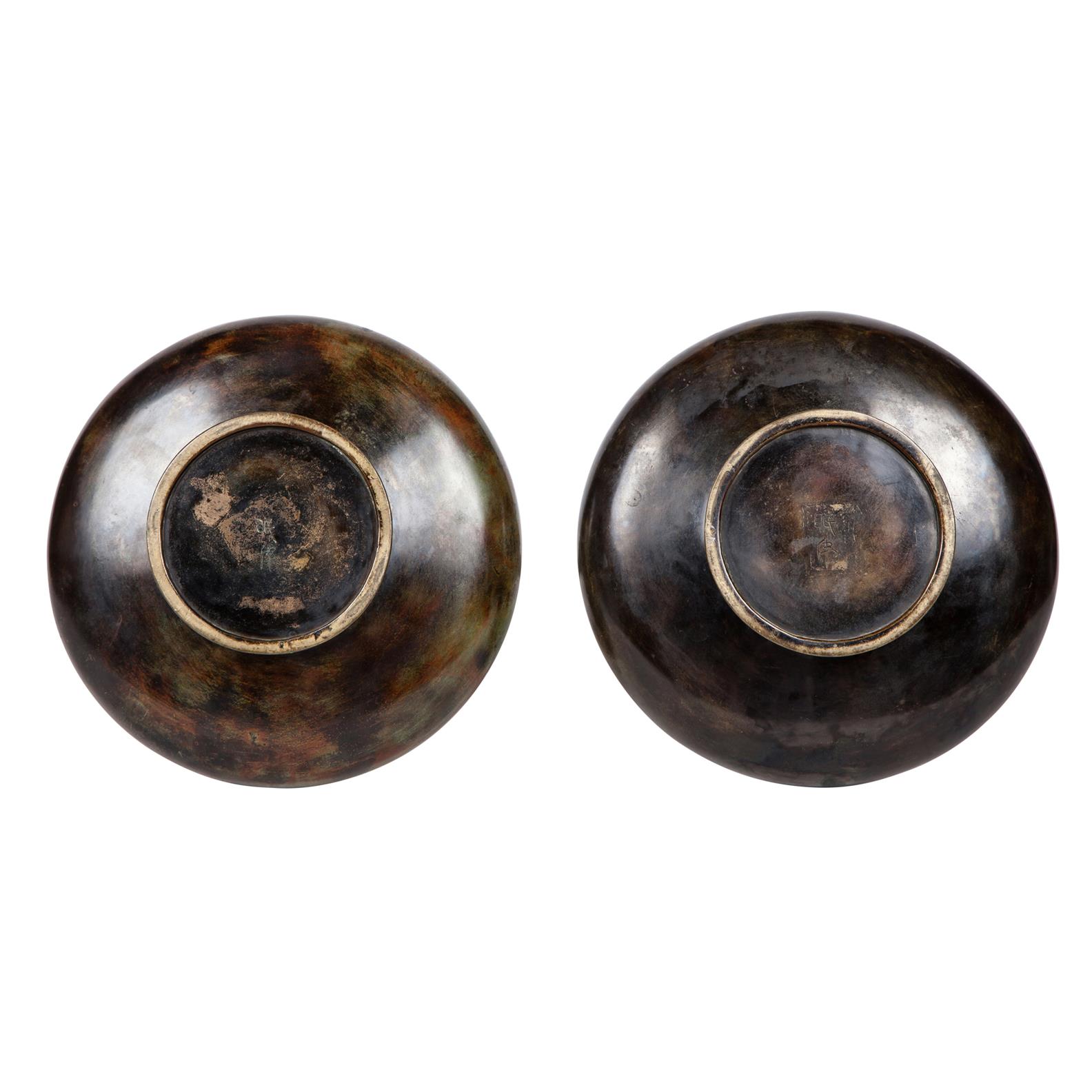 One decorated with lotus pods and a frog, the other with lotiform decoration and with birds, fine patina.